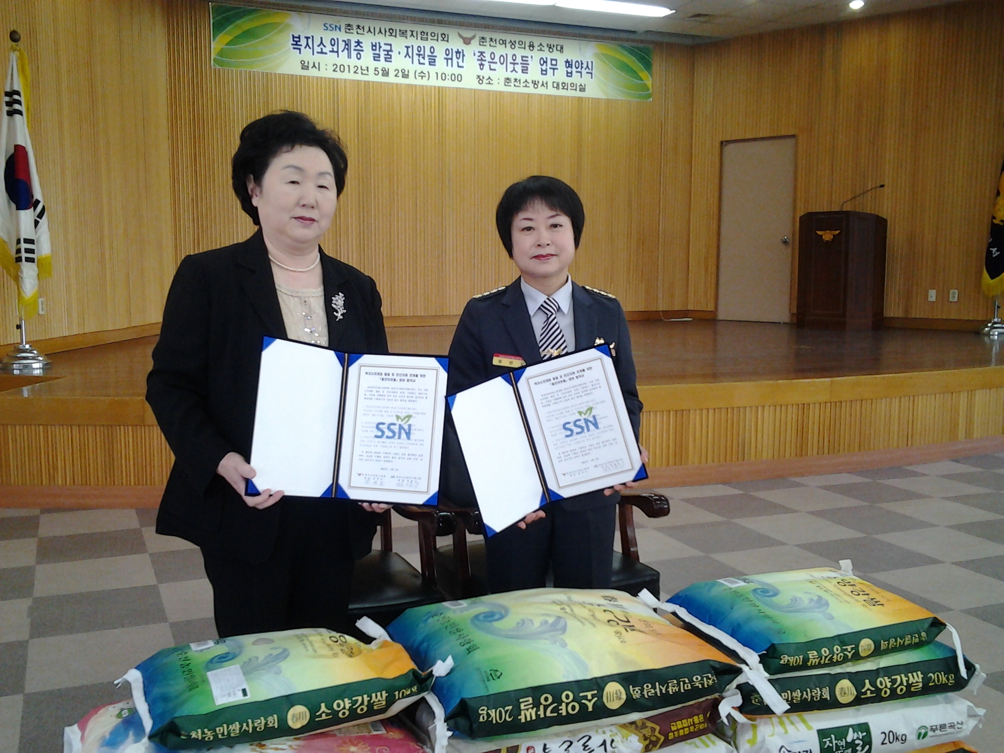 취임식때 받으셨던 쌀을 복지소외계층 발불.지원 "좋은이웃들"과 협약식을 맺고 모두 기증했습니다