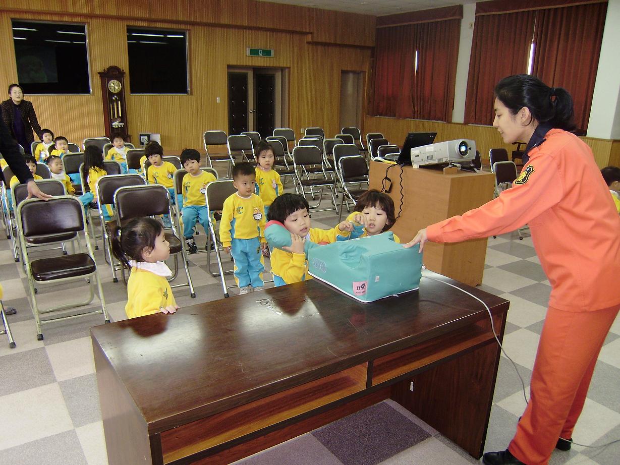 이날 교육은 화재 발생 시 대피 요령, 119신고방법, 소화기 사용법 등 이론교육과 소방관 아저씨와 함께하는 가상119신고하기, 소화기 사용해보기 등 체험위주의 교육도 병행하였다.