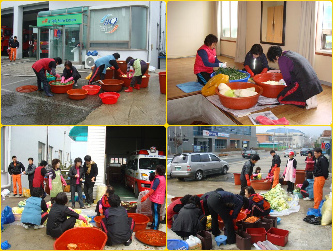 양구119안전센터(센터장 장춘식)은 2009. 11. 06 2일간에 겨울동안 먹을 김장을 양구여성의용소방대(대장 김만선) 대원분들께서 직접 재배한 배추와 김장에 들어가는 양념들을 준비하여 정성과 맛을 가미하여 김장을 담궈 주셨습니다. 특별히 양구 철쭉회장 김옥희님도 방문하시어 손을 보탰으며 매년 119안전센터 겨울에 필요한 양식을 해주심에 양구여성의용방대장 및 대원분들께 감사드립니다.