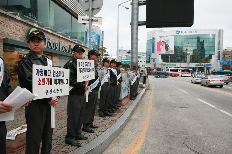 또한 춘천소방서는 식전 행사로 춘천시내 주요 도로변에서 소방공무원과 의용소방대원, 시민들이 함께 참여한 겨울철 불조심 캠페인을 전개하였다.