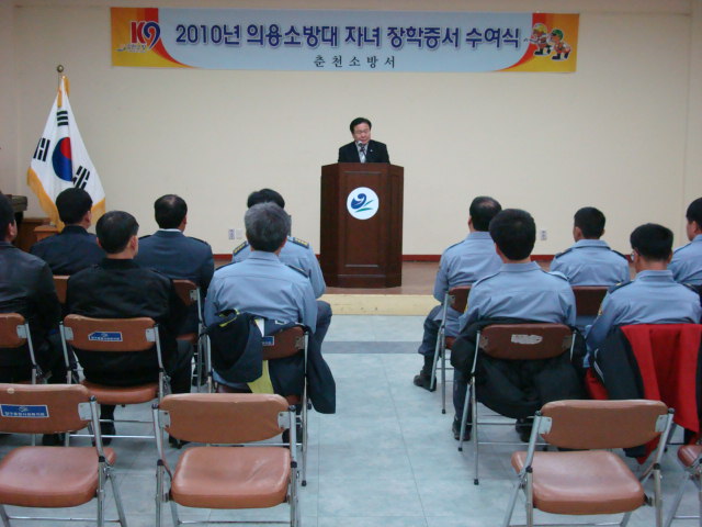 춘천소방서(서장 유용현)는 양구군 의용소방대 성적우수 자녀 대상으로 2010. 3. 12 14:00 양구복지센터에서 손병진, 박명숙 의용소방대 연합회장이 참석한 가운데 의용소방대 자녀 대학생14명, 고교생 2명에게 장학증서 수여했다. 지역사회 발전에 노력하고 있는 의용소방대원의 자녀 장학금 지급으로 의용소방대원 사기진작 및 활성화에 크게 기여하고 학업에 열중하고 있는 학생들에게 큰 도움이 되고 있다.