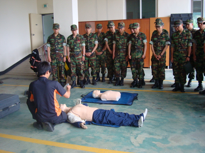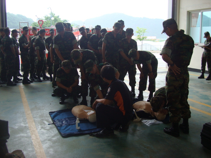 사내119안전센터(센터장 이호석)에서는 2010.06.11(토) 10:00 ~ 11:00 사내119안전센터를 방문한 27사단 외출,외박 군장병 40여명을 대상으로 심폐소생술 및 기도폐쇄 응급처치교육을 실시하였습니다. 매주 실시되는 응급처치교육 군장병들의 열정에 박수를 보냅니다.