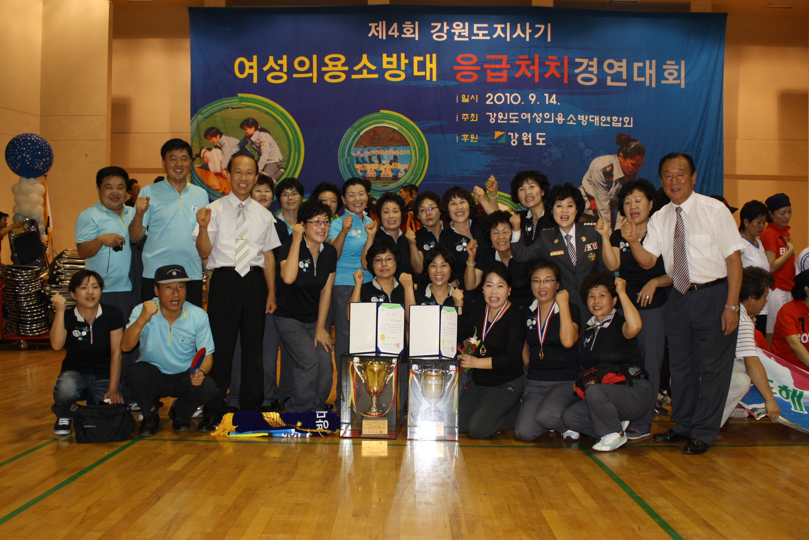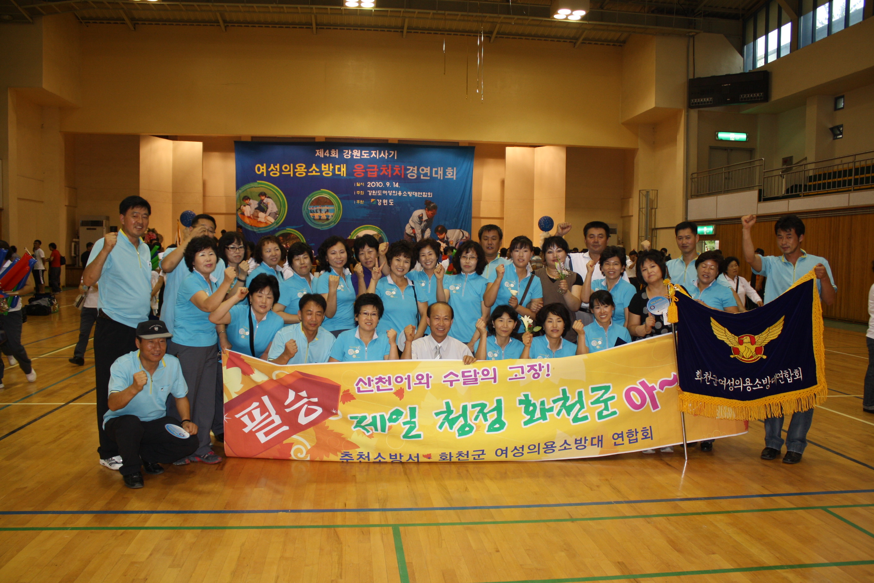 춘천소방서(서장 조완구) 화천군 여성의용소방대는 9월 14일 원주 농민문화체육센터에서 개최된「제4회 강원도지사기 여성의용소방대 응급 처치경연대회」3종목(심폐소생술위, 부목고정응급처치, 장기자랑)에 출전 종합 2위 성적을 거두었습니다.