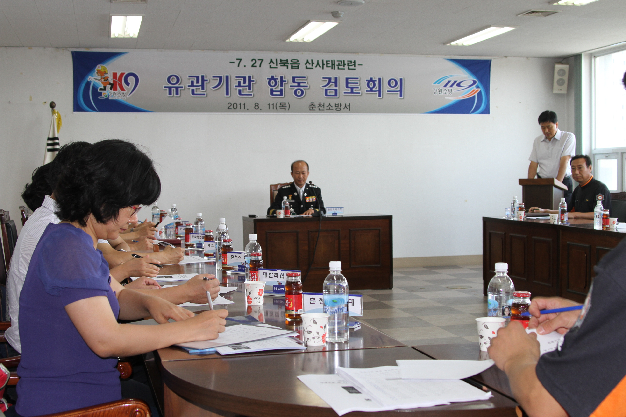 춘천소방서(서장 조완구)는 11일 14:00시 춘천소방서 소회의실에서 유관기관 합동 검토회의를 가졌습니다. 회의 주제는 7월 27일 신북읍 천전리에서 발생한 산사태 재난현장과 관련하여 유관기관별 대응활동에 대해 토론하고 향후 대형 재난 발생시 협조사항등을 논의하였습니다.