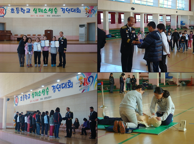 춘천소방서(서장 조완구)는 2011. 10. 25.『제 5회 초등학교 심폐소생술 경연대회』를 양구읍 양구초등학교에서 개최하였습니다. 이번 대회에는 양구관내 초등학교 7개교 17개팀 34명의 초등학생이 선수로 참가하여 그동안 틈틈이 갈고 닦은 실력을 마음껏 발휘하여 용하초등학교에서 대상을 수상하는 등 학생들의 열정이 가득한 하루였습니다.