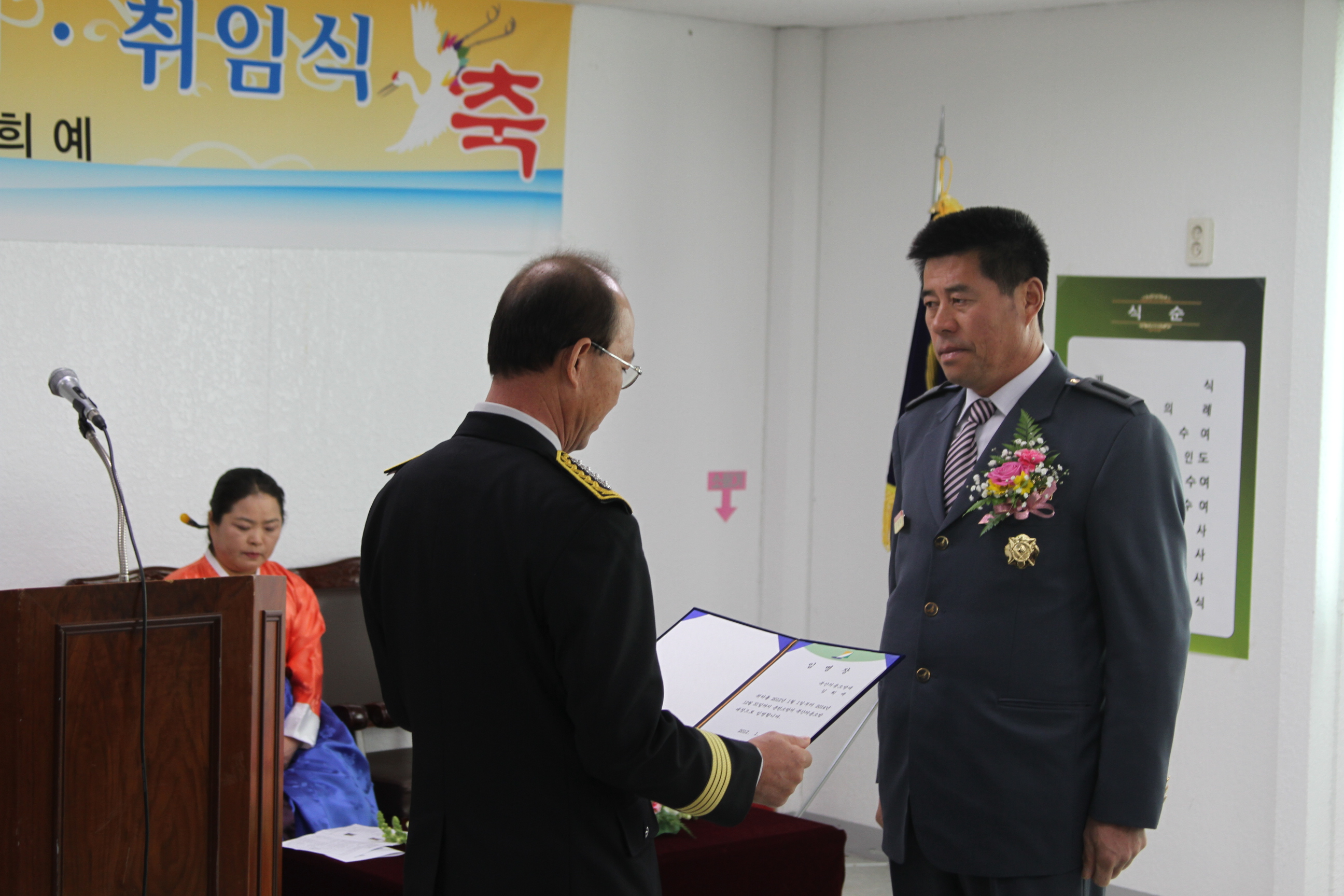 춘천소방서(서장 조완구)는 10일 오전 11시 북산면사무소에서 북산의용소방대장 이.취임식을 개최했다. 허천 국회의원님 등 100여명이 참석한 가운데 김희예 취임대장에게는 임명장을, 박장수 이임대장에게는 도지사 및 춘천소방서장 감사패를 수여했다.