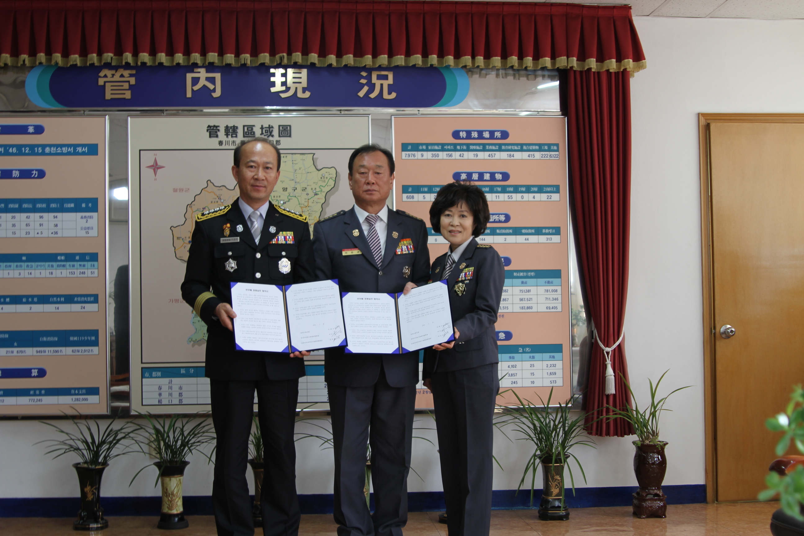 춘천소방서(서장 조완구)에서는 2012.03.07(수) 범도민 청렴의식 확산을 위한 "반부패 청렴실천 협약" 체결식을 가졌습니다. 이날 춘천소방서는 가장 이해관계가 돈독한 춘천시의용소방대 연합회 및 춘천시여성의용소방대 연합회와 협약을 체결하며 공직사회 부패근절 및 강원도 전역으로 청렴문화 의식 확산 의지를 다졌습니다.