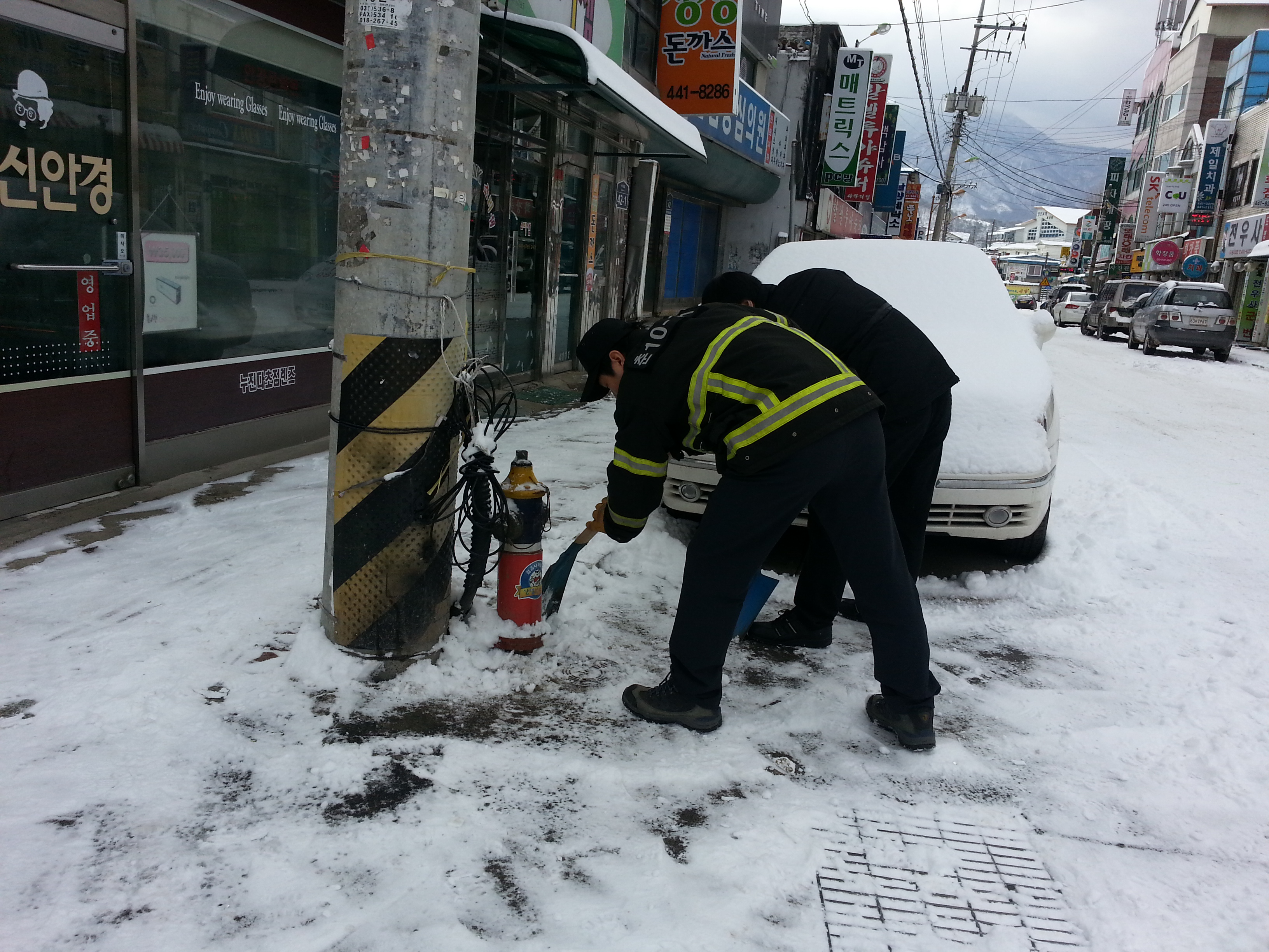 눈 덮힌 열악한 도로상황이지만, 소화전 주변 제설작업을 실시하고, 또한 현장의 불법 주정차들 이동 조치를 취함으로써 언제 있을지 모르는 상황에 항상 대비하며 준비태세를 갖추었습니다.