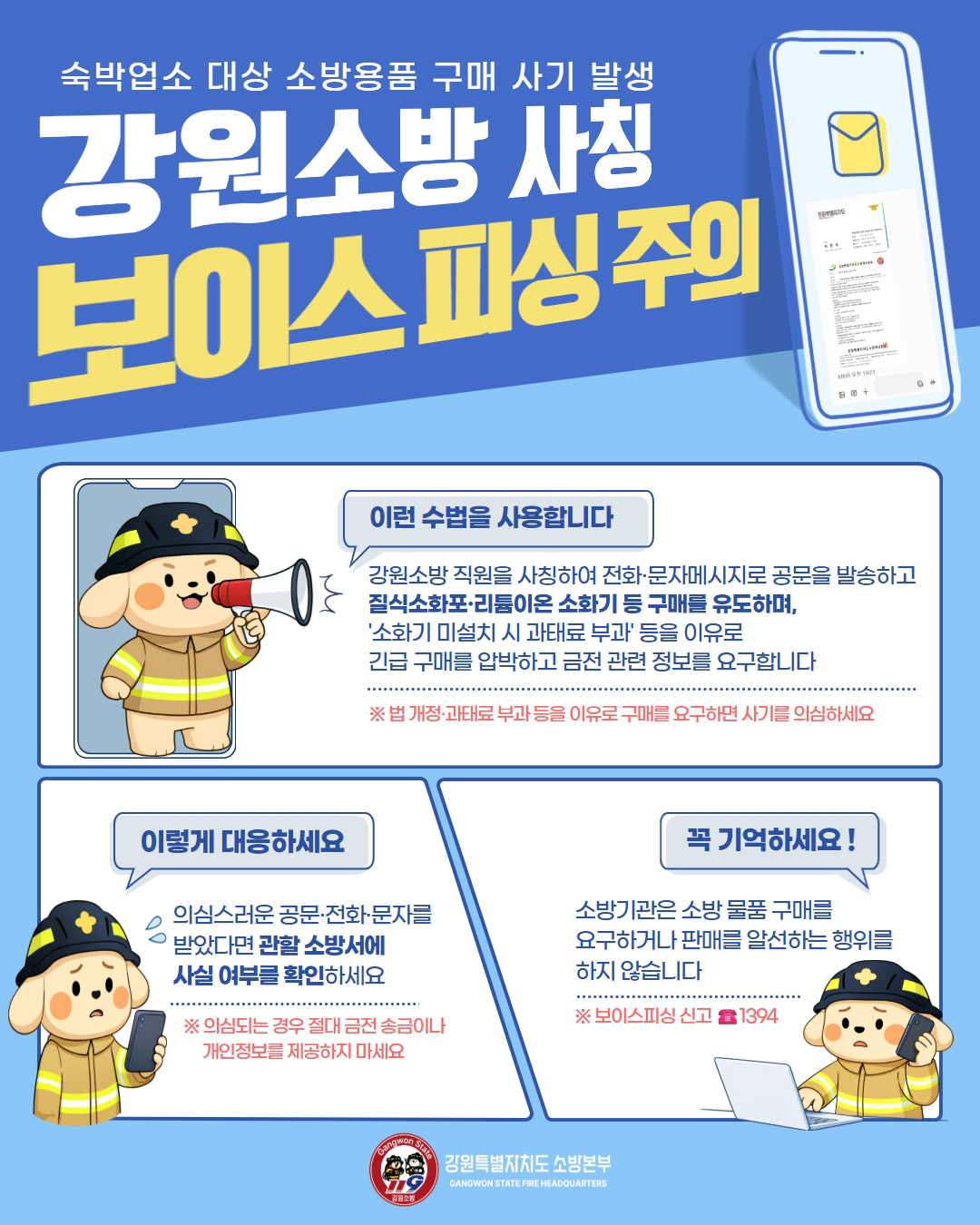 숙박업소 대상 소방용품 구매 사기 발생 강원소방 사칭 보이스 피싱 주의