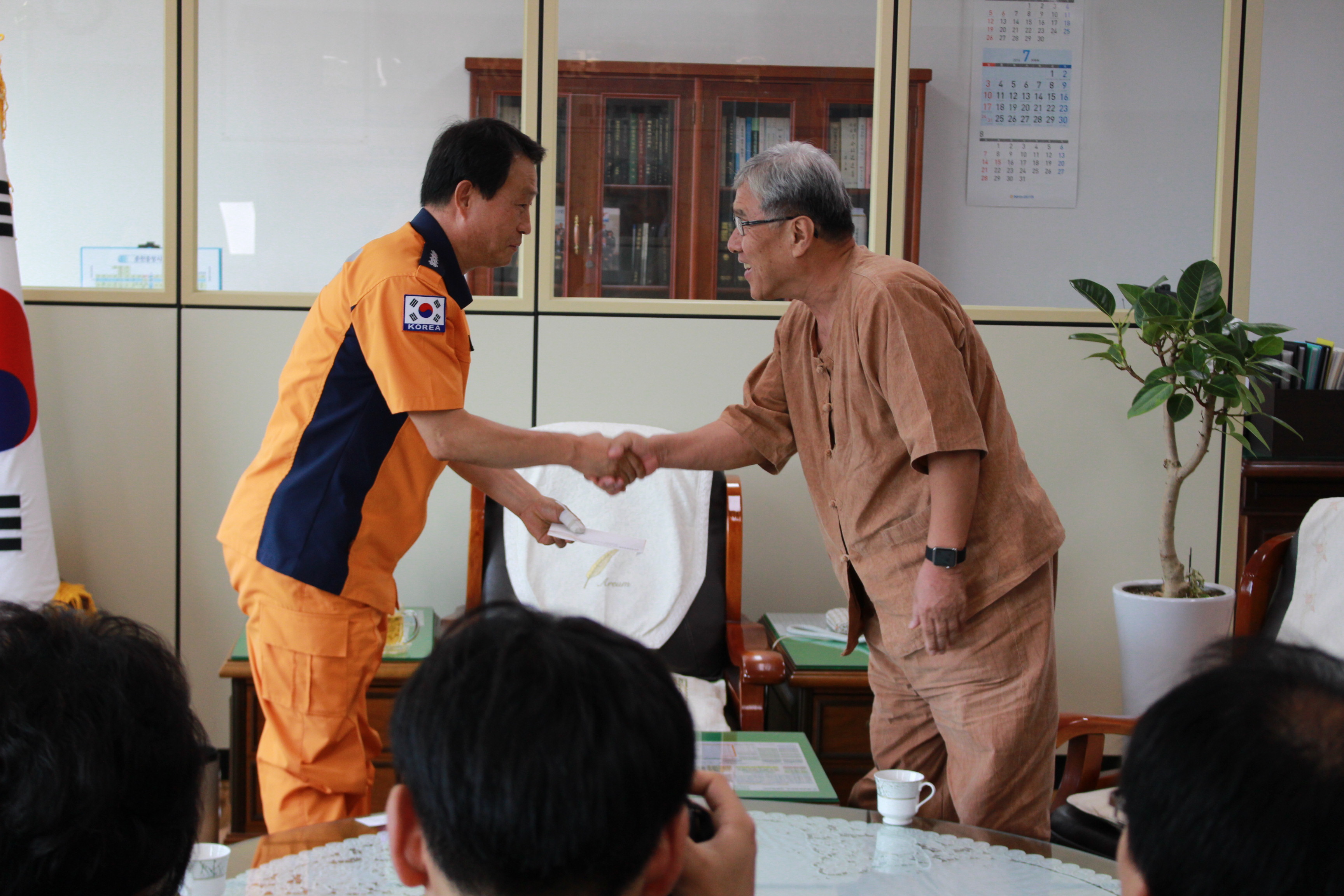 춘천중앙교회 권오서 담임목사 등 교회 관계자 9명은 2016. 7. 21(목) 춘천소방서를 방문 7. 18(월)17:29에 발생한 중앙교회 화재현장에서 고생한 직원들을 격려 방문하여 금일봉을 전달했다.