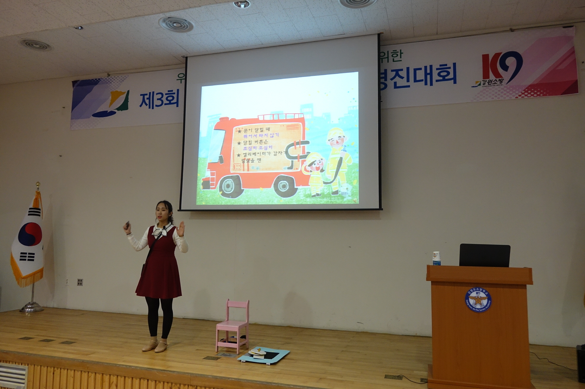 이날 춘천소방서 대표로 출전한 남가람 소방사는 첫 날 공통주제 경연에서는 ‘엘리베이터나 에스컬레이터는 조심히 타고 내려요’ 경연을 했고, 둘 째 날 자유주제에서는 ‘불이야! 불이 났어요’ 주제로 영·유아 대상 화재발생 시 대처 교육 시연을 선보여 강원도 16개 소방서 대표 중 최우수상을 차지했으며, 향후 개최되는 전국 소방안전 강사 경진대회에 강원도 대표로 출전한다.