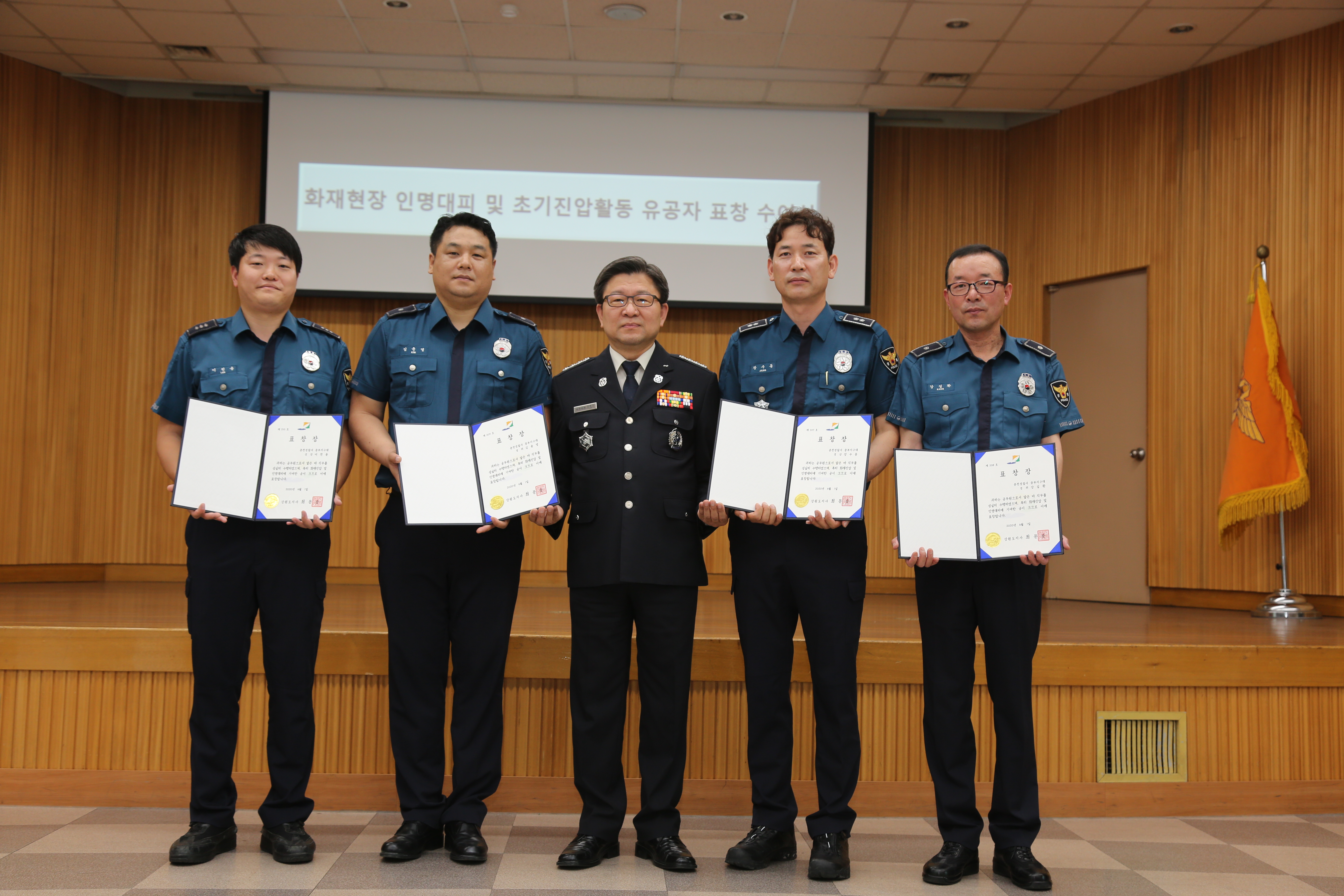 인명구조 유공 공무원 4명은 춘천경찰서 중부지구대에서 근무중인 장수동(남,50)ㆍ강길화(남,53)ㆍ김윤영(남,42)ㆍ이천용(남,33)로 올해 2월 효자동 소재 다가구 주택화재현장에서 각 가구별 인명을 대피시켜 소중한 생명을 지켰다.