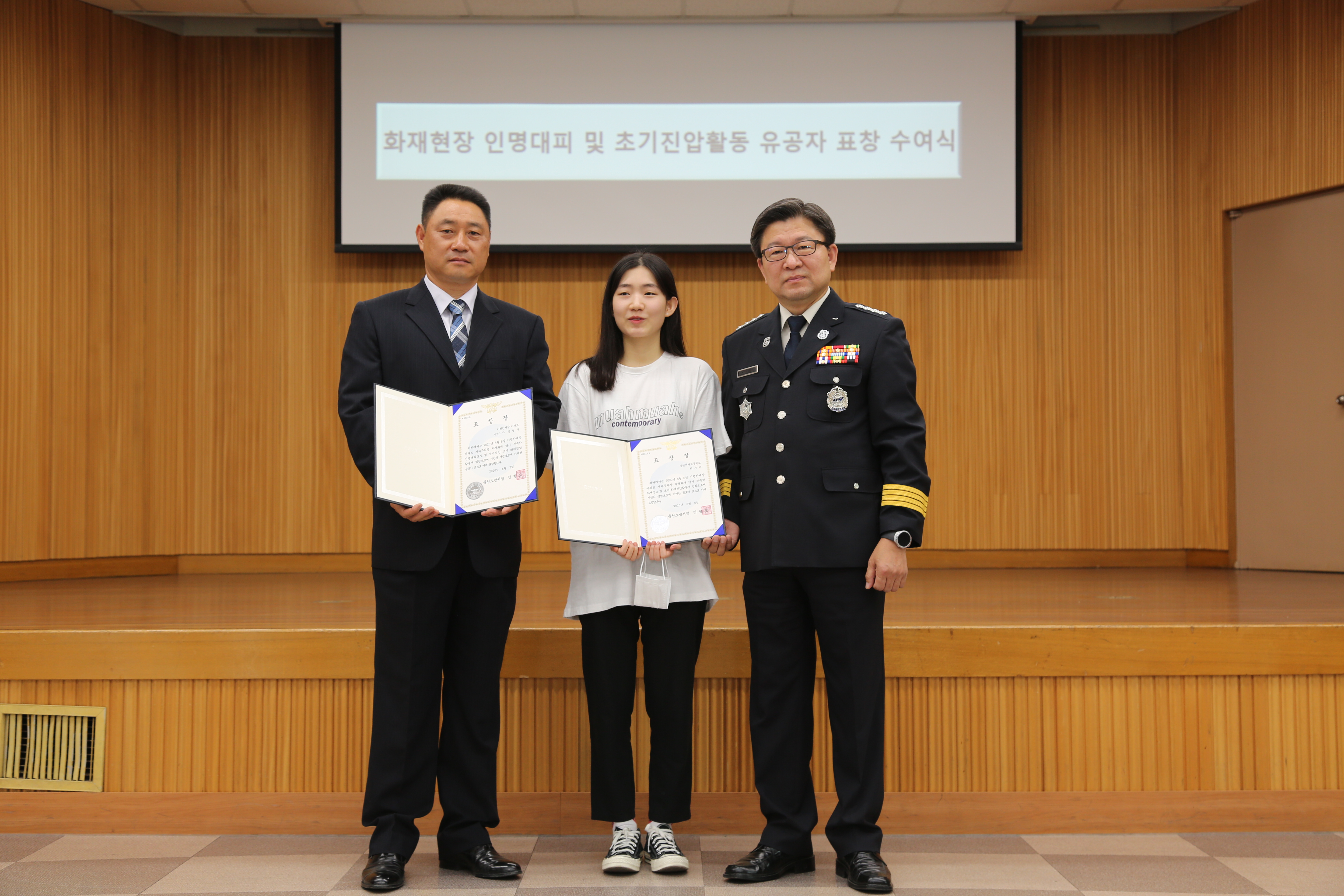 화재진압 유공 민간인 김필재(남, 50)와 최수아(여, 18)씨는 지난달 6일 춘천시 소양동 한 아파트에서 지하 주차장에서 발생한 차량화재발생시 신속하게 119에 신고하고 즉시 옥내소화전 등을 이용해 화재진압에 도움을 줬다.