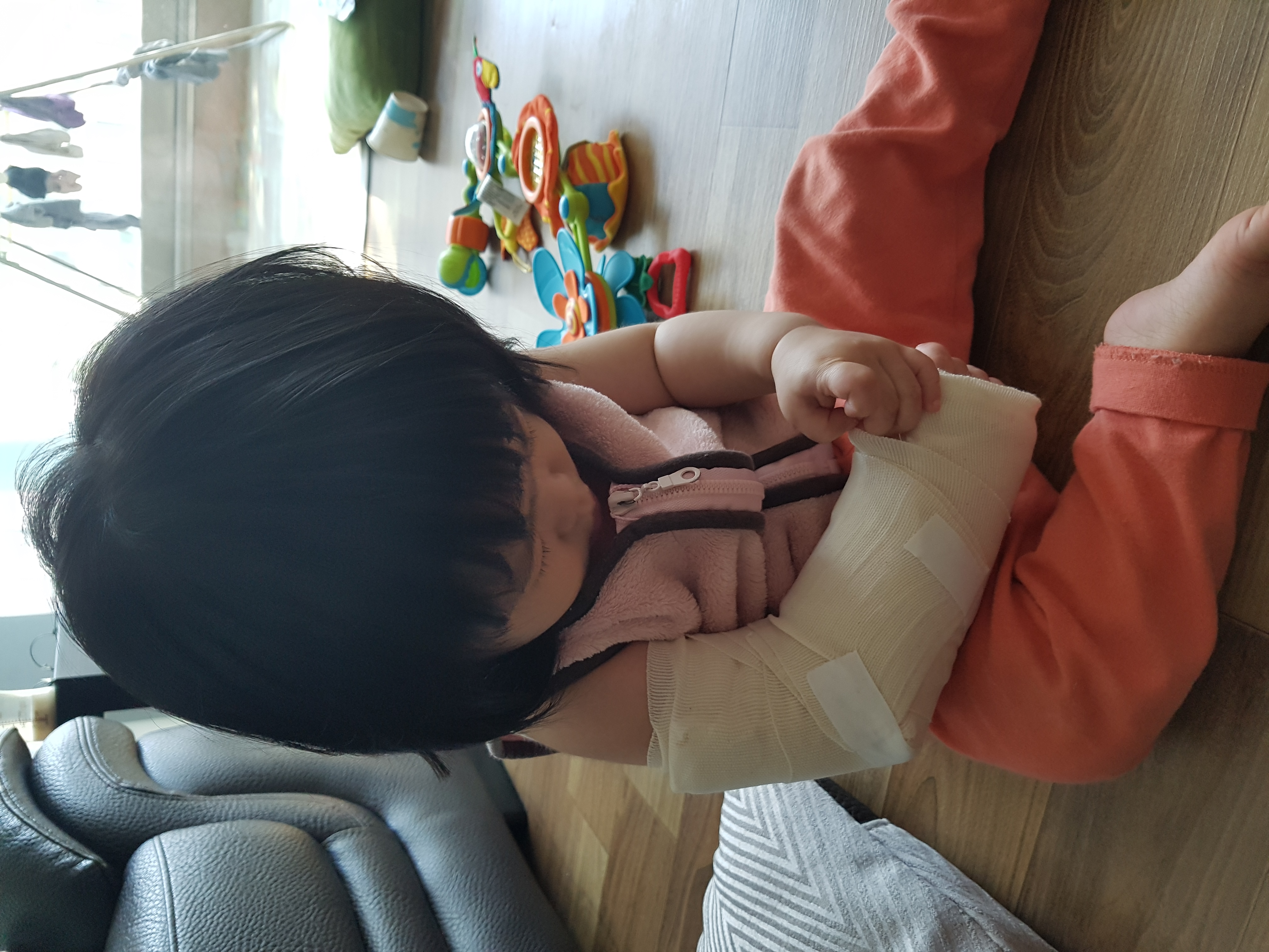 애기는 팔꿈치탈골이 되면서 인대가 끼는바람에 손을 아직도 쓰질못해요ㅠ