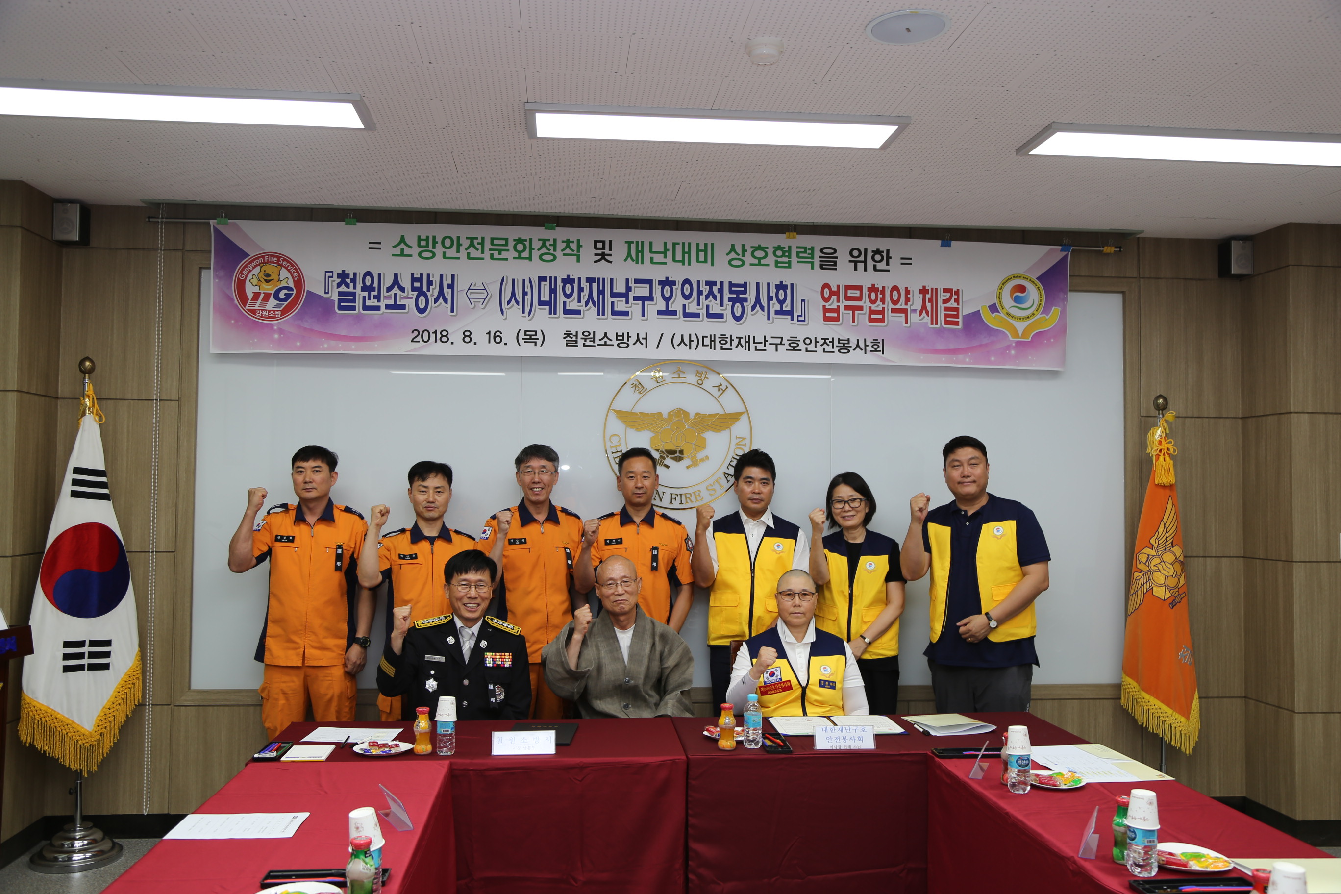 철원소방서(서장 남흥우)는 16일 오전 소회의실에서 도피안사 도견 스님, 대한재난구호안전봉사회 이사장 현해 스님 등 15명이 참석한 가운데 생명존중 문화 확산과 재난 시 상호협력을 위한 업무협약 체결식을 가졌다.