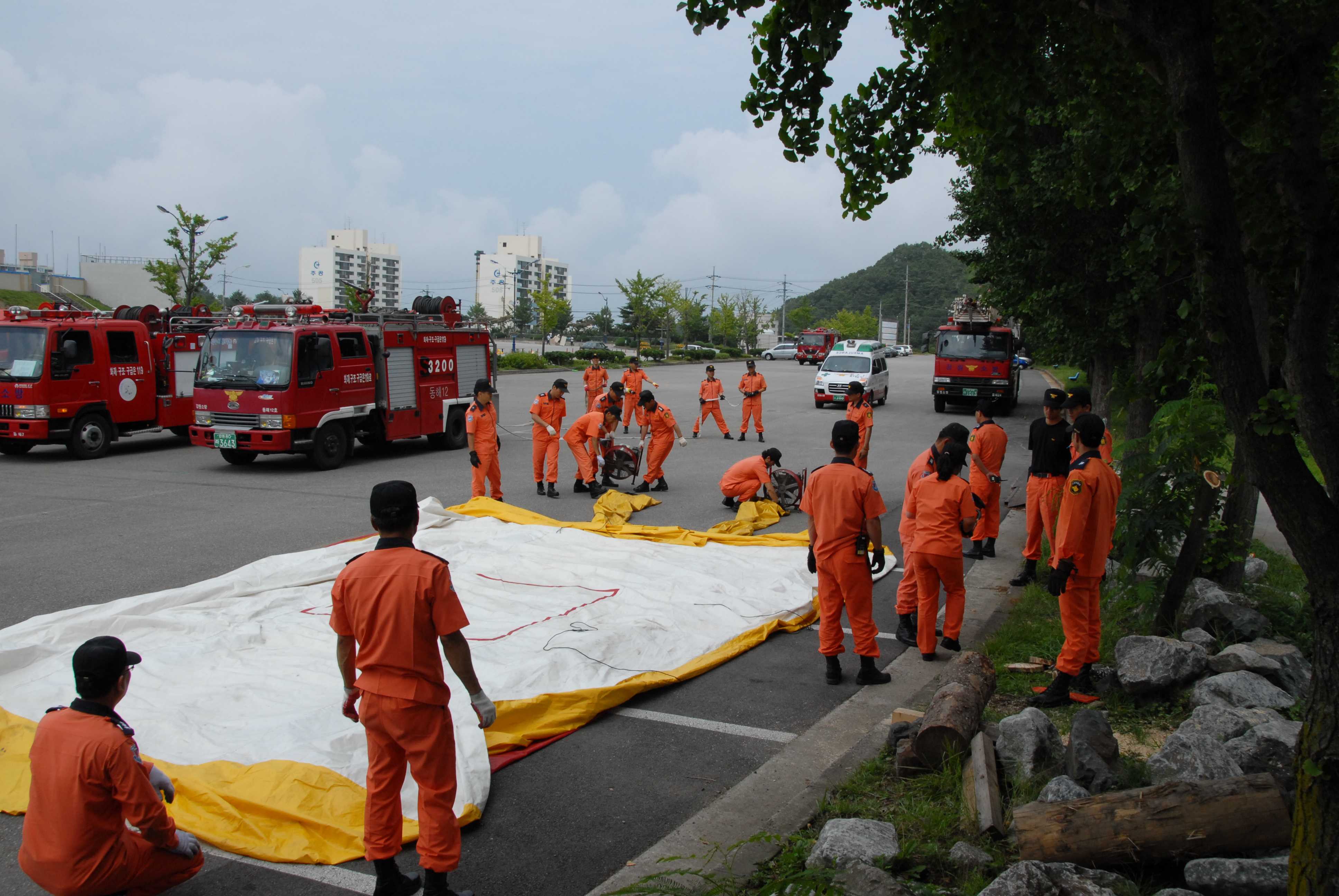 훈련방식은 각 센터별 고층건축물 화재시 화재진압과 동시에 공기안전매트를 사용하여 요구자를 구조 하는 방식으로