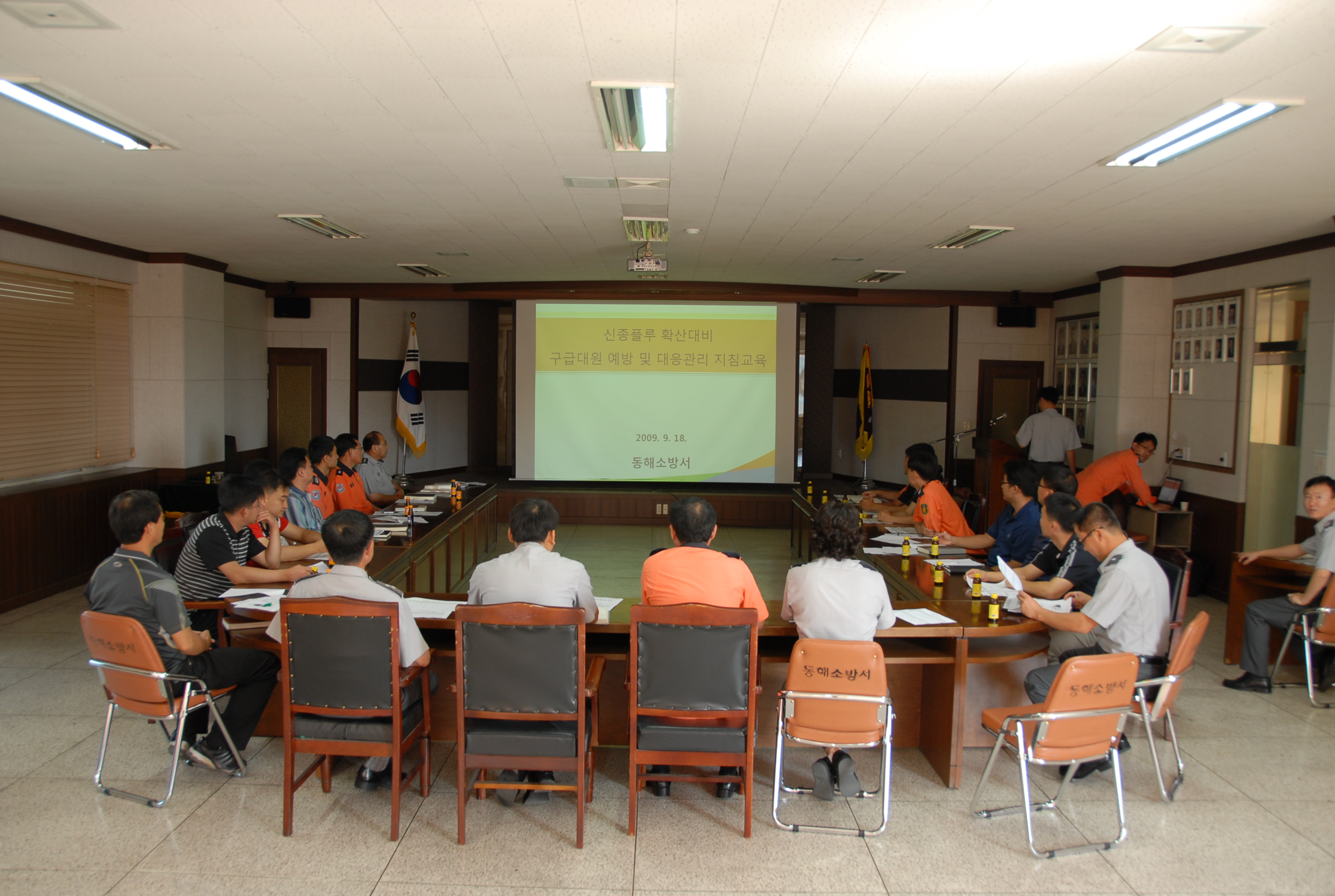 동해소방서는 18일(금) 2층 대회의실에서 구급대원 전원이 참석한 가운데 신종인플루엔자 A(H1N1) 확산에 대비 119구급대원의 감염예방 및 대응관리지침 교육을 실시하였다.