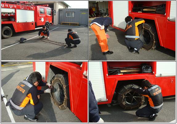 묵호119안전센터(센터장 이승원)는 겨울철 눈길 안전사고 대비 체인장착 훈련을 실시하였습니다. 특히, 묵호119안전센터는 타관내보다 고지대 지역이 많아서 눈이 조금만 쌓여도 체인을 장착하여야 하기 때문에 항시 체인장착 훈련을 실시하고 있습니다.묵호고지대여!! 그대들은 묵호119안전센터가 책임지겠노라~~~
