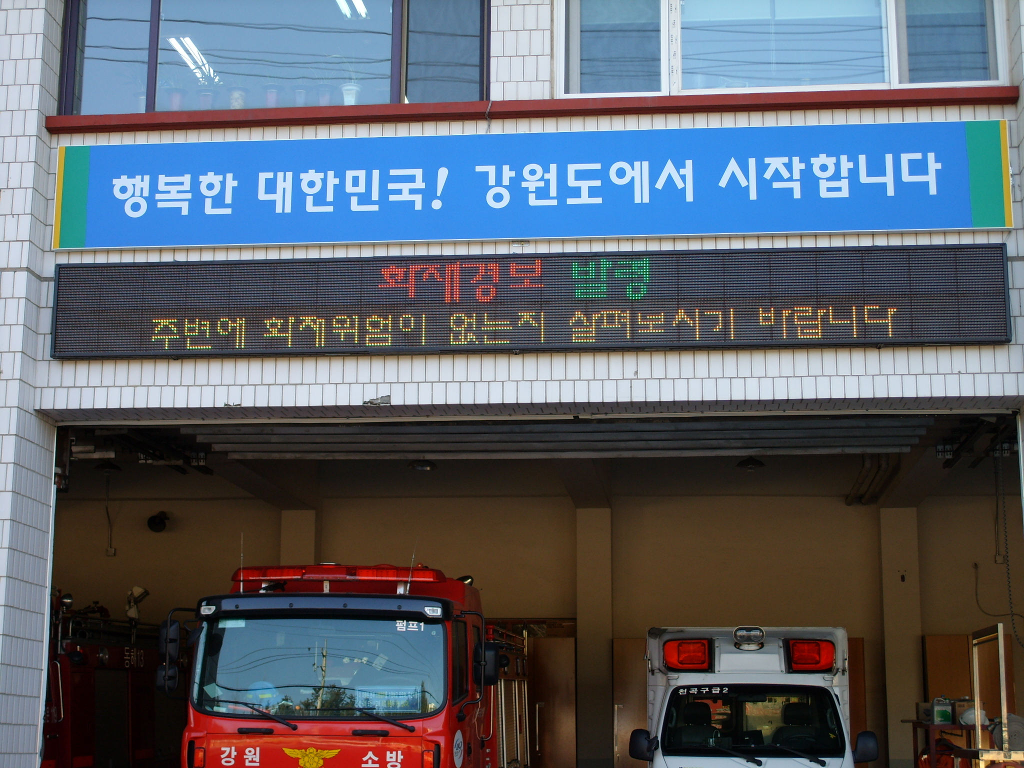 동해소방서(서장 김남숙) 에서는 19일 청사 전면에 소방활동 및 화재예방 홍보를 위한 LED 전광판을 설치하였습니다~^^
