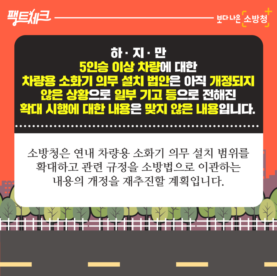 하지만 5인승 이상 차량에 대한 차량용 소화기 의무 설치 법안은 아직 개정되지 않은 상황으로 일부