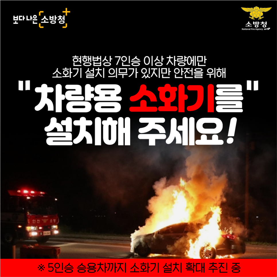 현행법상 7인승 이상 차량에만 소화기 설치 의무가 있지만 안전을 위해