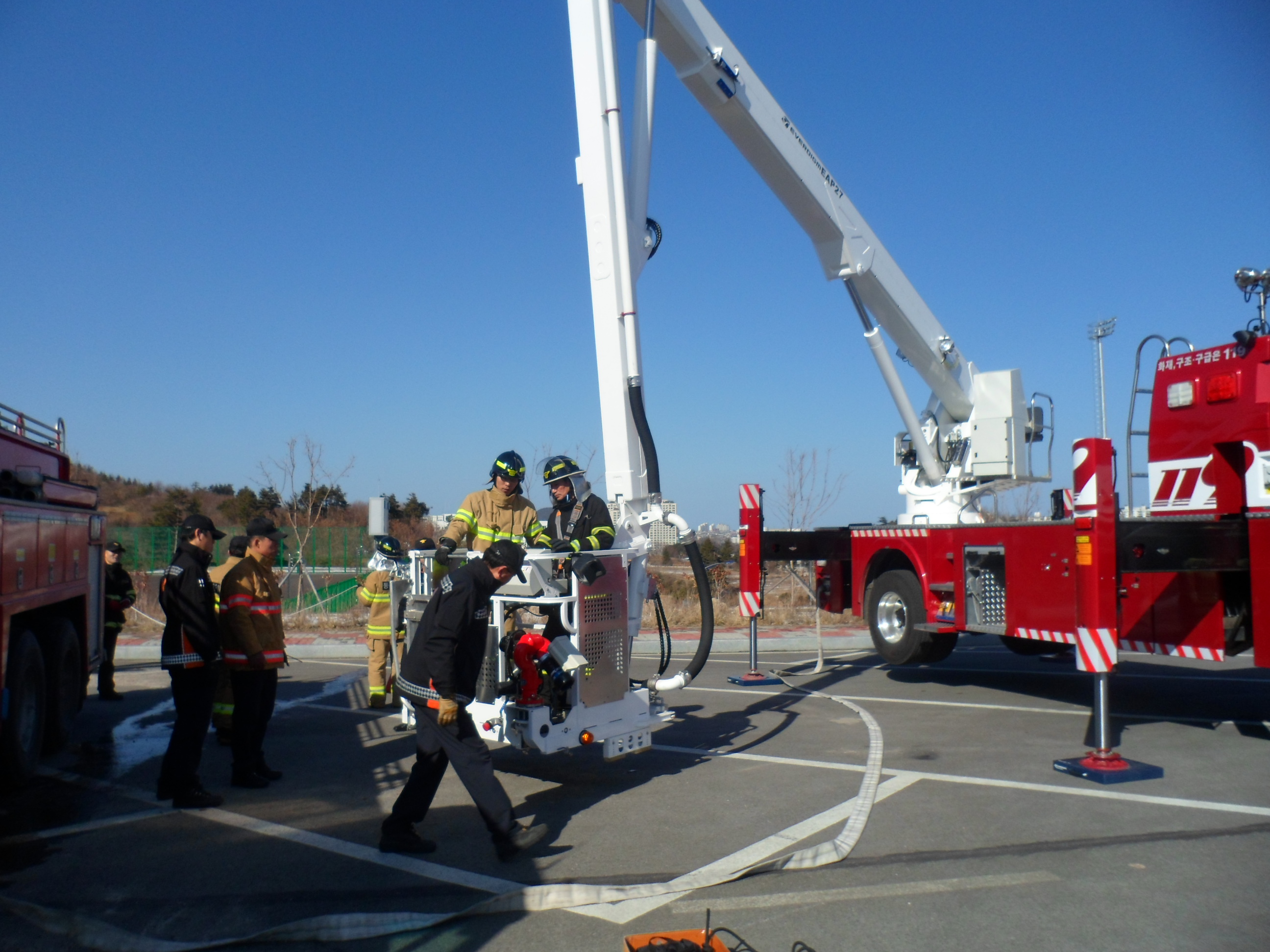 동해소방서(서장 김남백)는 2월 20일 14:30경 동해체육관 공터에서 굴절사다리차 방수포 조작훈련을 실시하였다.