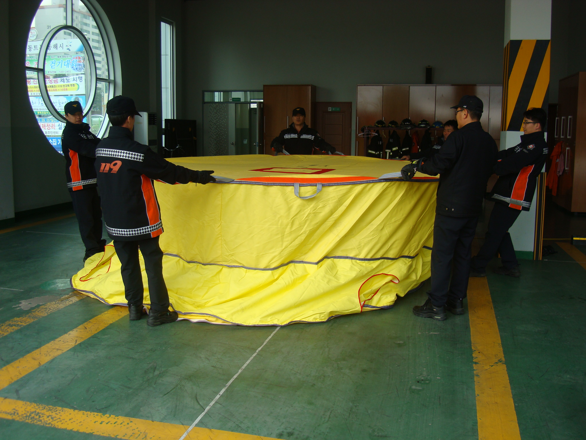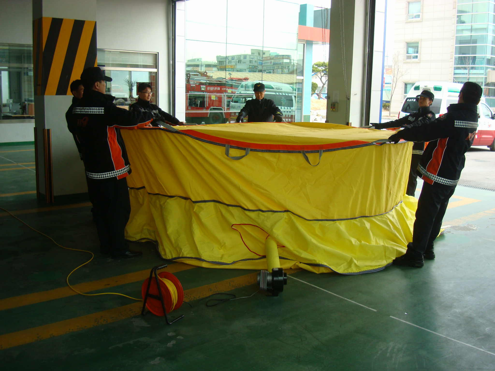 공익요원이 달려와 뛰어 보았으나 6명이 잡고있어도 힘이 부치고(3층에서 뛰어 내리는 인명을 받는다면...) 공기를 넣는 펌프가 작아 공기를 채우는데도 오래 걸리는 단점이 있었습니다.
