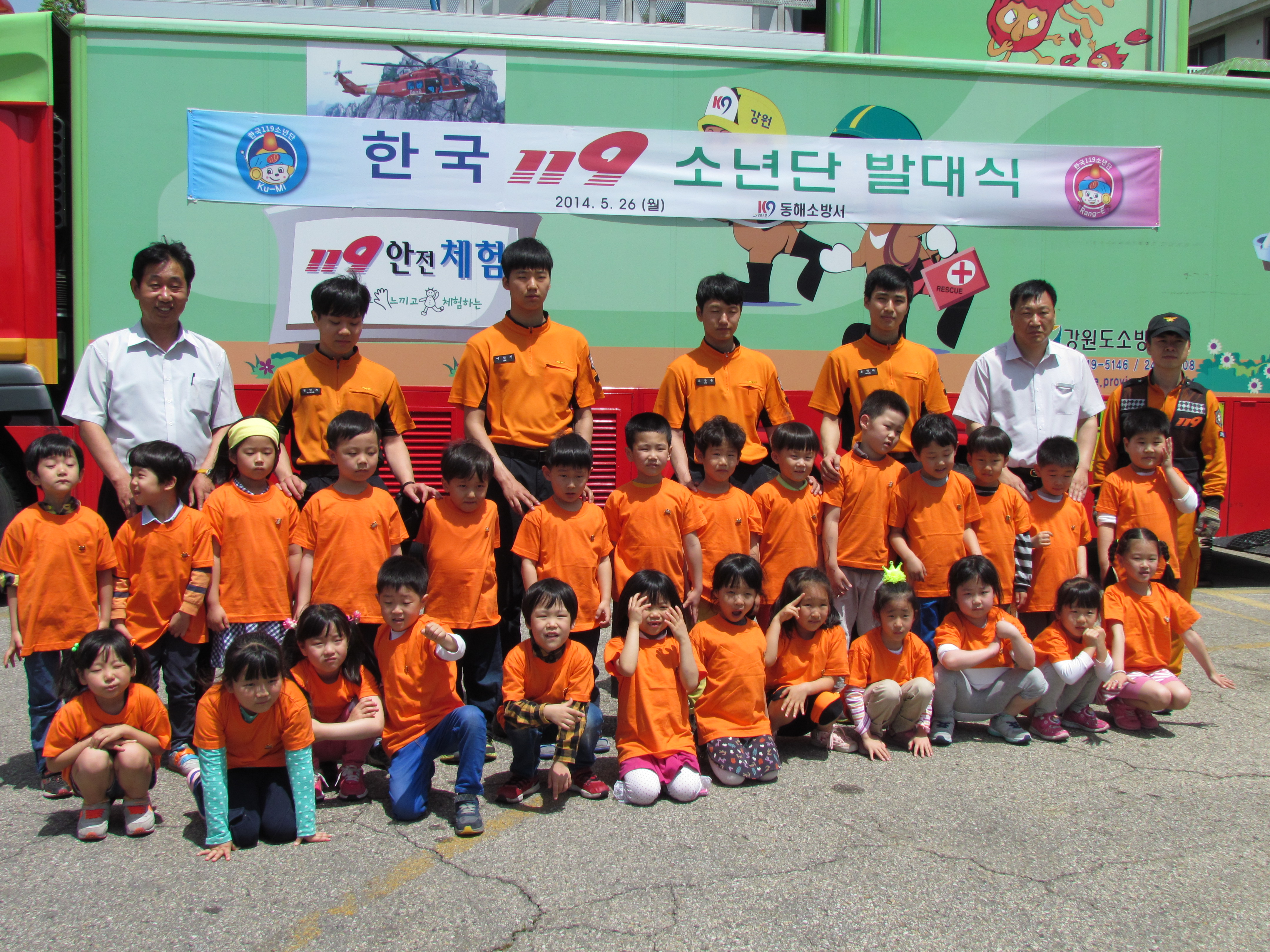 동해소방서(서장 주항중)는 5월26일 본서 후정에서 리라유치원, 해오름유치원 원생 및 교사, 소방서 관계자 등 120여 명이 참석한 가운데 119 소년단 발대식을 했습니다.