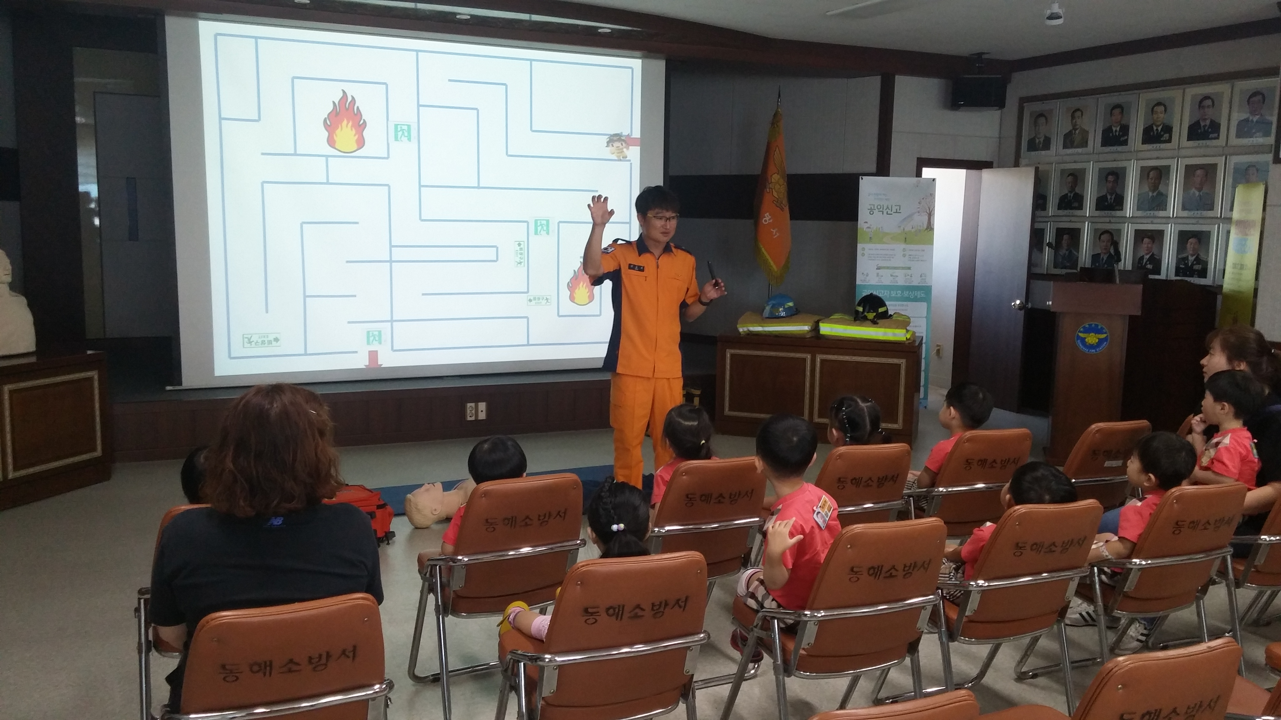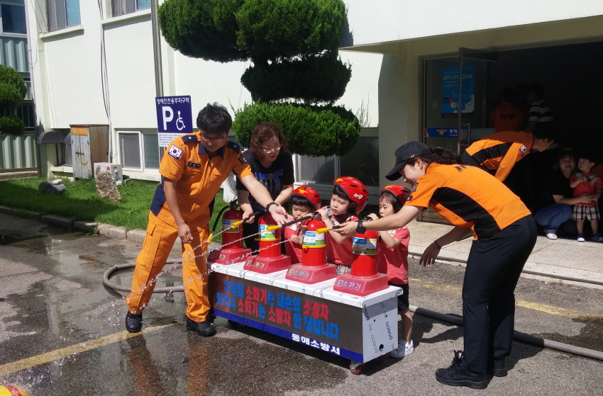 작년에 어린이집 아이들이 동해소방서견학을 하였을때, 소방관님들께서 열정적으로 교육해주시고,