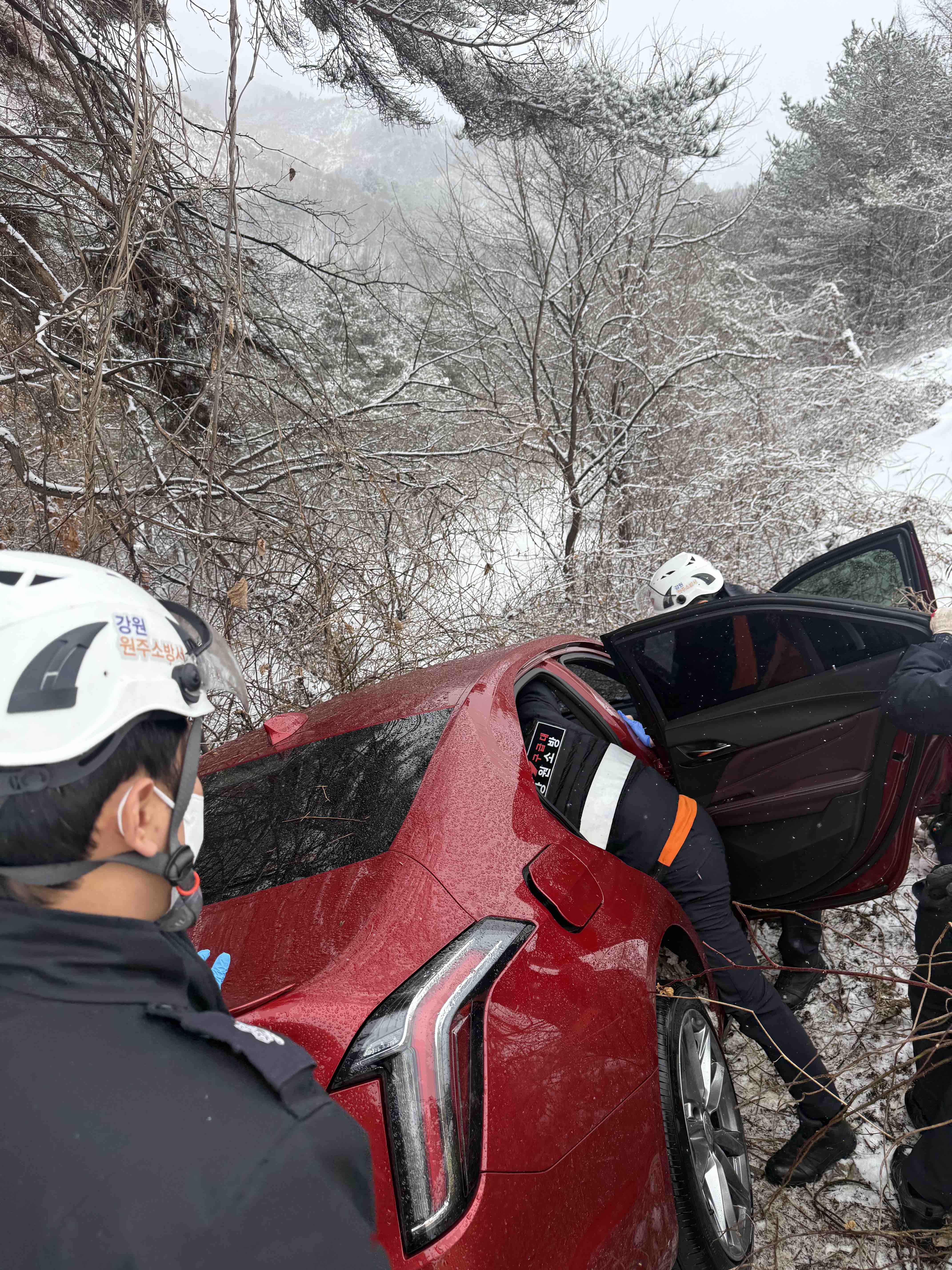 3. 내 용 : 캐딜락 승용차 1대 눈길에 경사지로 미끄러져 구조대상자 1명 발생하여
