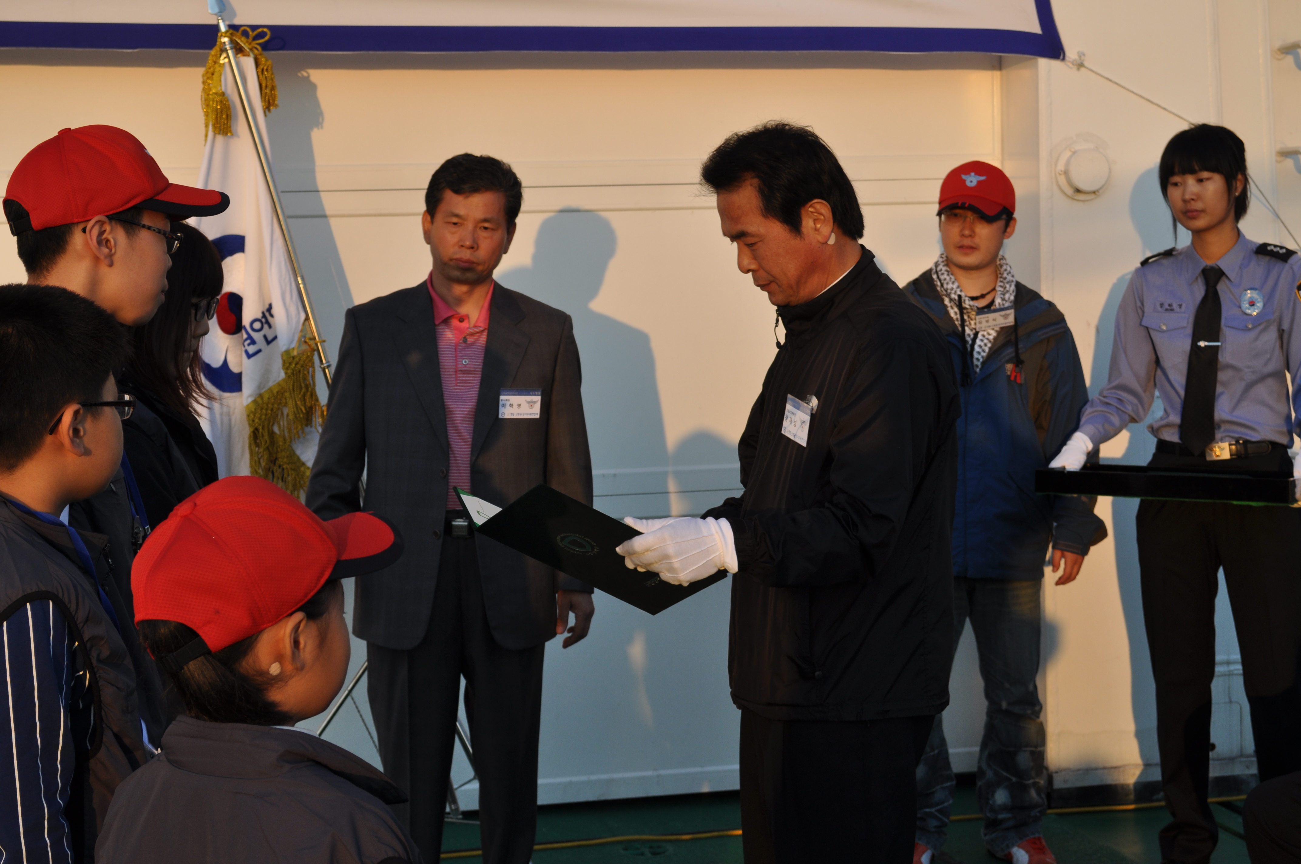 10월10일 해양함정(태평양호3007호)에서 왕재섭본부장님께서 글짓기대회수상들에게 소방방재청장표창을 수상했음.