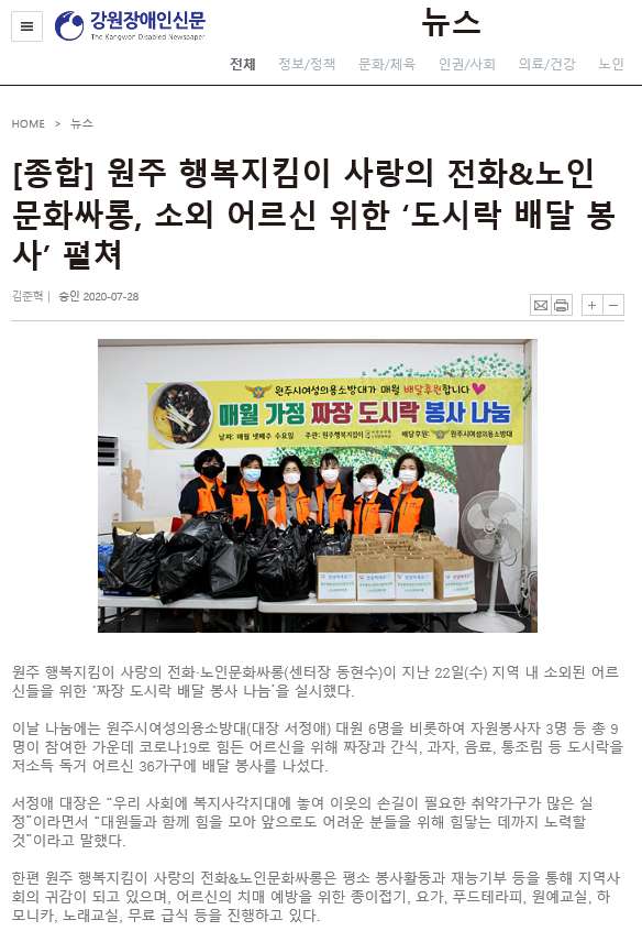 | 25177 | 원주여성의용소방대 소외 어르신 위한 '도시락 배달 봉사' 펼쳐 | 원주홍보 | 2020-08-06 | 1307 | |