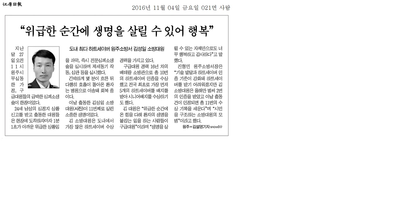 | 20762 | (원주)심정지 환자를 11명째 살린 소방관 | 원주홍보 | 2016-11-04 | 122 |