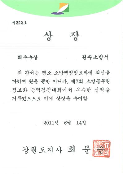 | 12994 | 제7회 정보화능력경진대회 최우수상 수상 | 원주소방서 | 2011-06-16 | 93 | |