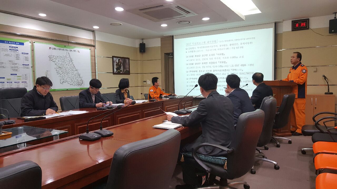 강원도 소방본부(본부장 이흥교)는 16일 오전 8시 30분 종합상황실 전략상황실에서 강원도 일부지역에서 건조경보와 건조주의보가 발효된 가운데 산불 등 화재가 잇따라 이에 대한 대처 상황 보고회의를 개최하고 화재(산불) 위험지구 순찰 강화 및 신속한 초등대응으로 대형화재 확산 방지에 만전을 기 할 것을 지시했다.