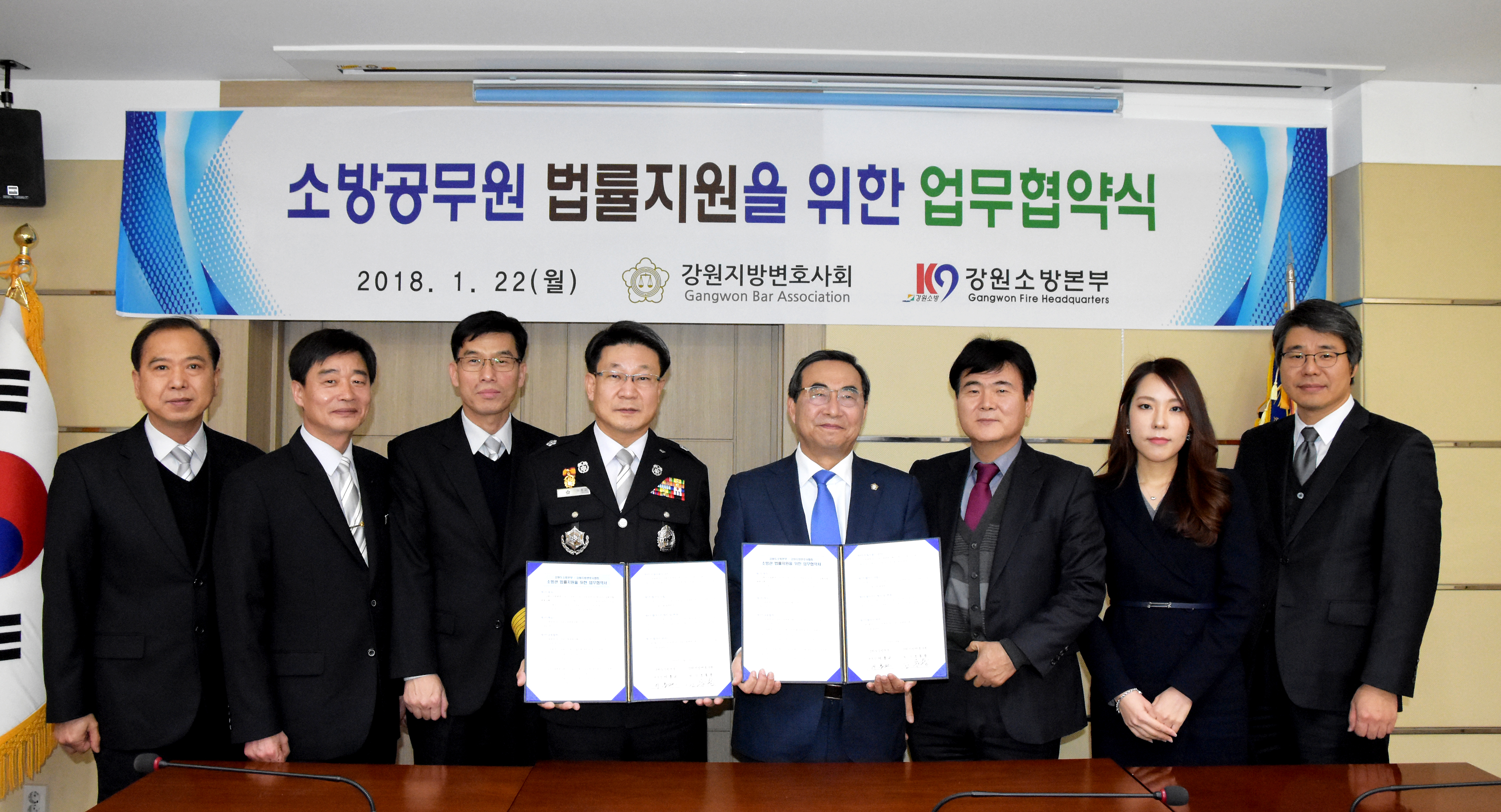 강원소방본부(본부장 이흥교)와 강원지방변호사회(회장 조동용)는 1월 22일(월) 오전 11시 도청 소방본부에서 소방업무 수행 중 법적 분쟁에 휘말린 소방공무원을 위한 법률지원시스템 구축 업무협약을 체결하였다. (붙임참조)
