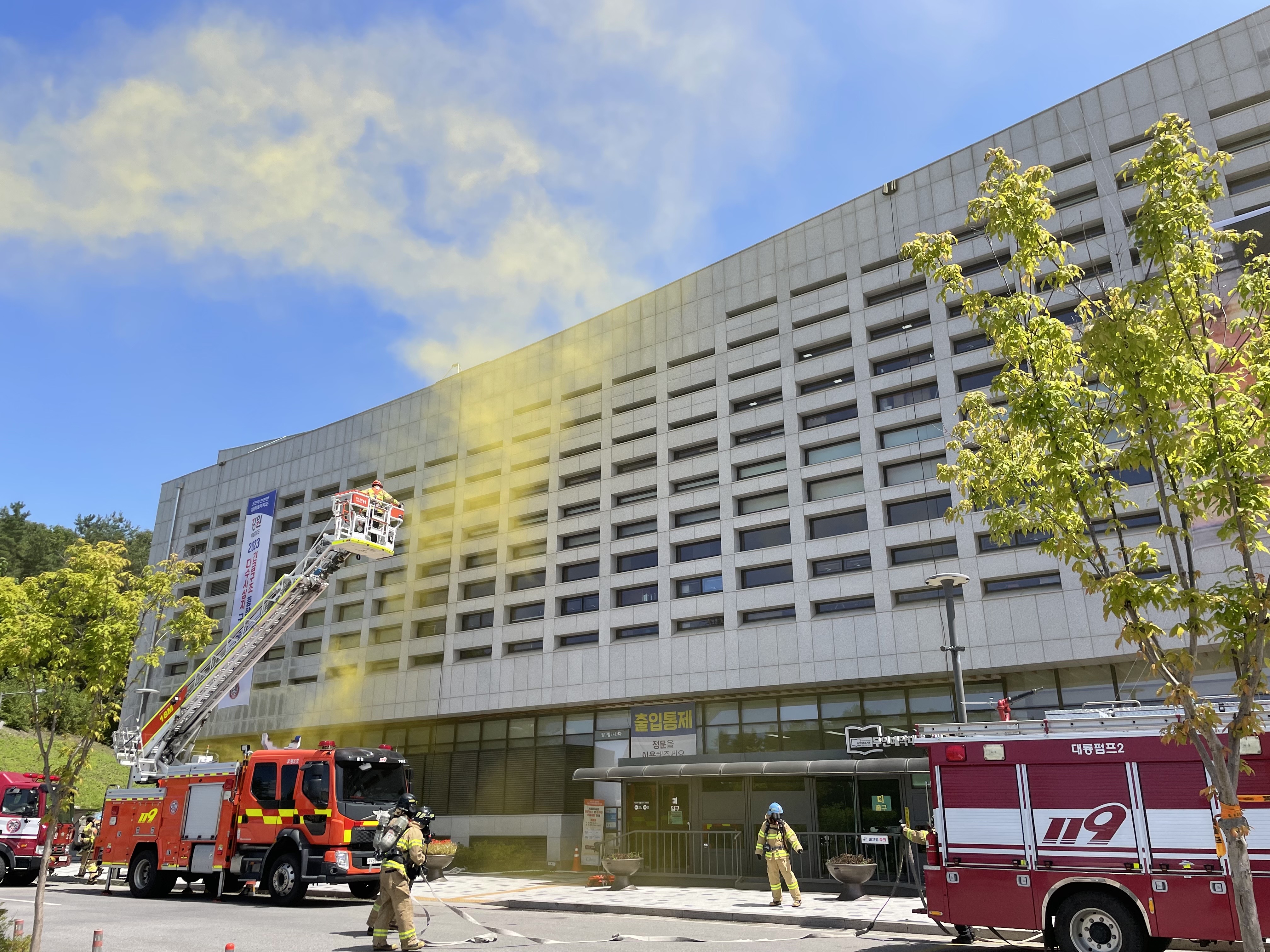 〇 강원특별자치도소방본부는 23일 14시 춘천시립도서관에서 2023년도 도단위 긴급구조종합훈련을 실시했다 밝혔다.
