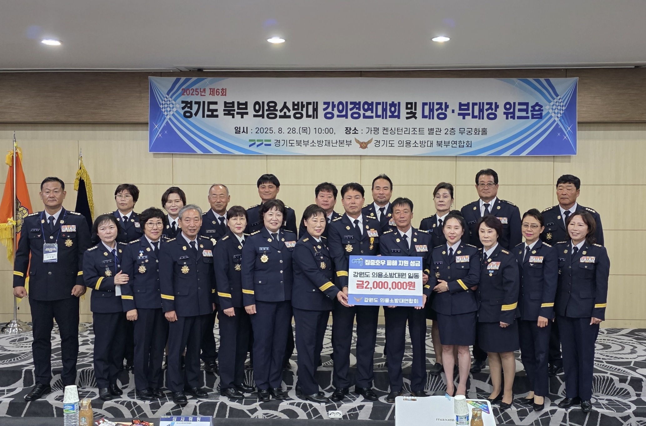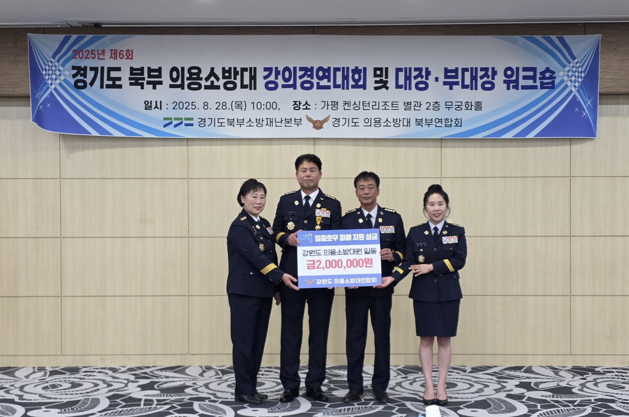○ 강원특별자치도 소방본부(본부장 김승룡)는 8월 28일 경기도 가평군 켄싱턴리조트 무궁화홀에서 열린 경기도 북부 의용소방대 강의경연대회 2부 행사에서 강원특별자치도 의용소방대연합회가 수해복구 성금 200만 원을 전달했다고 밝혔다.