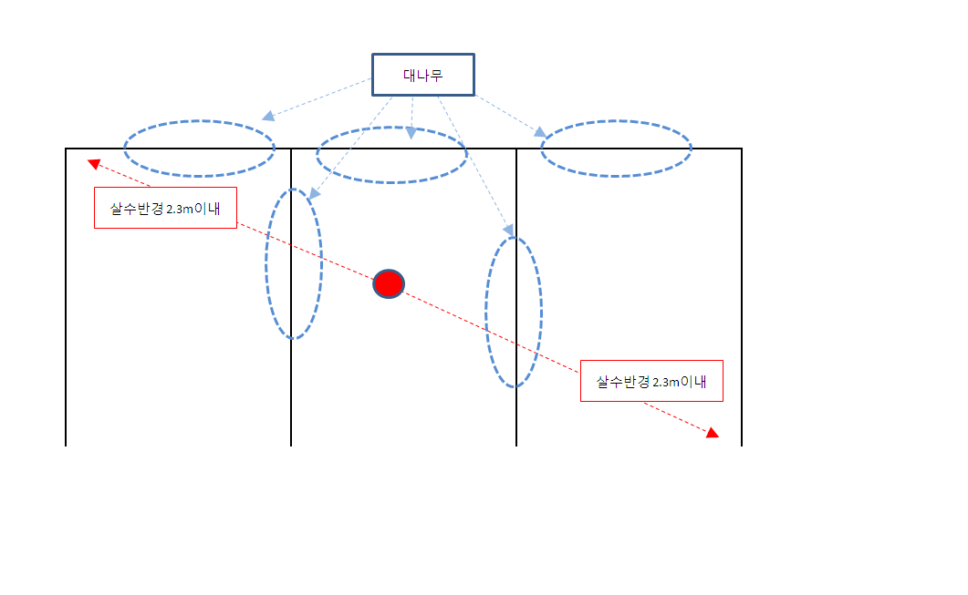 수직방향으로 설치된 대나무를 스프링클러헤드의 살수 장애물로 보아 테이블마다 스프링클러헤드를