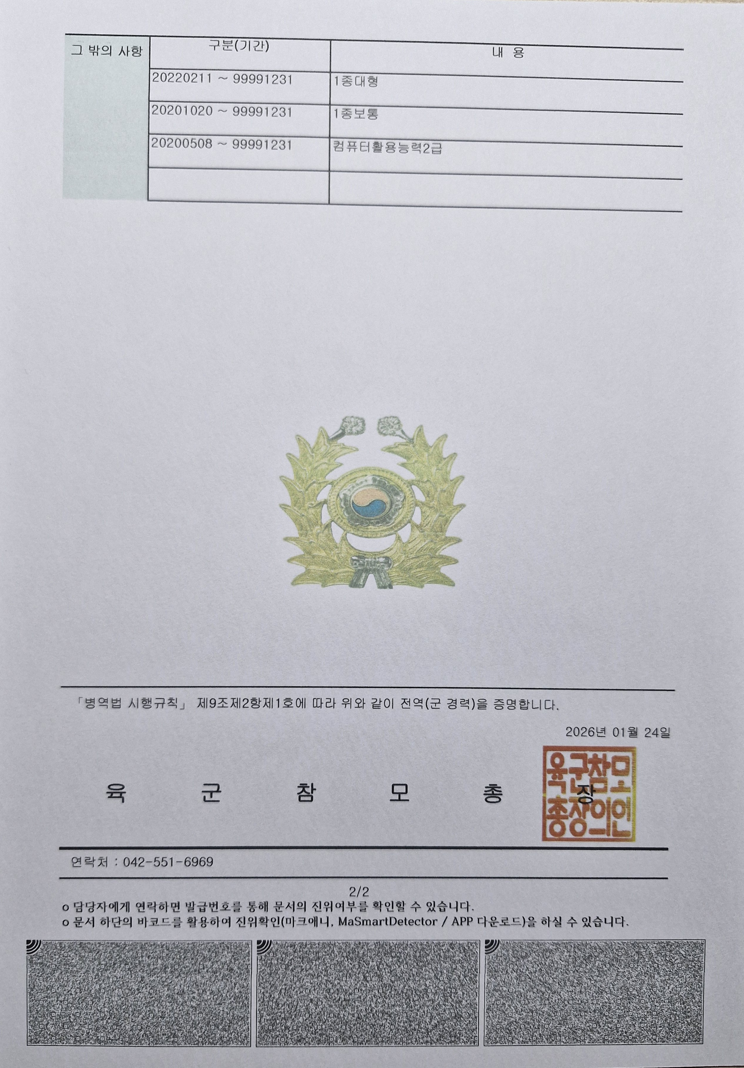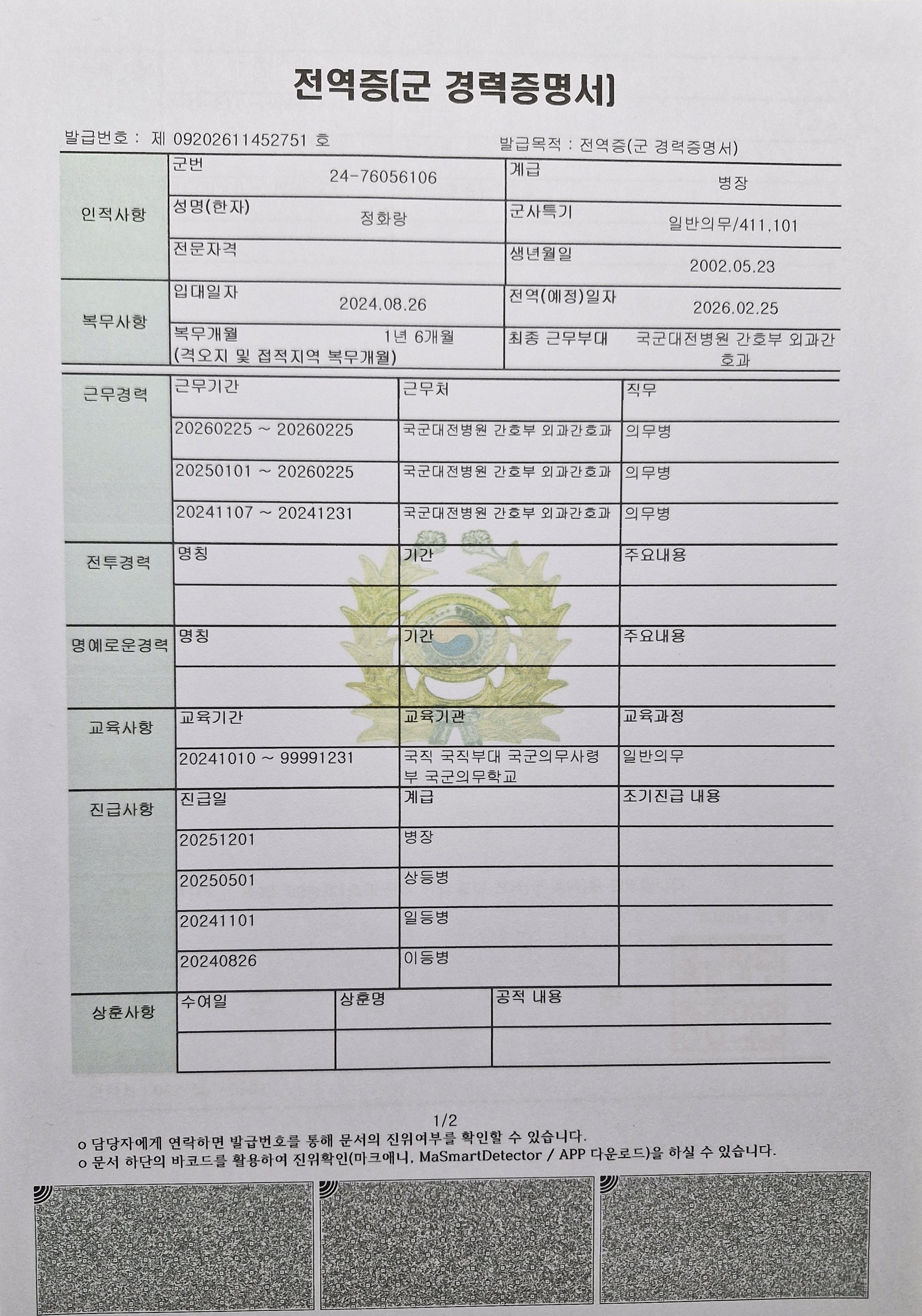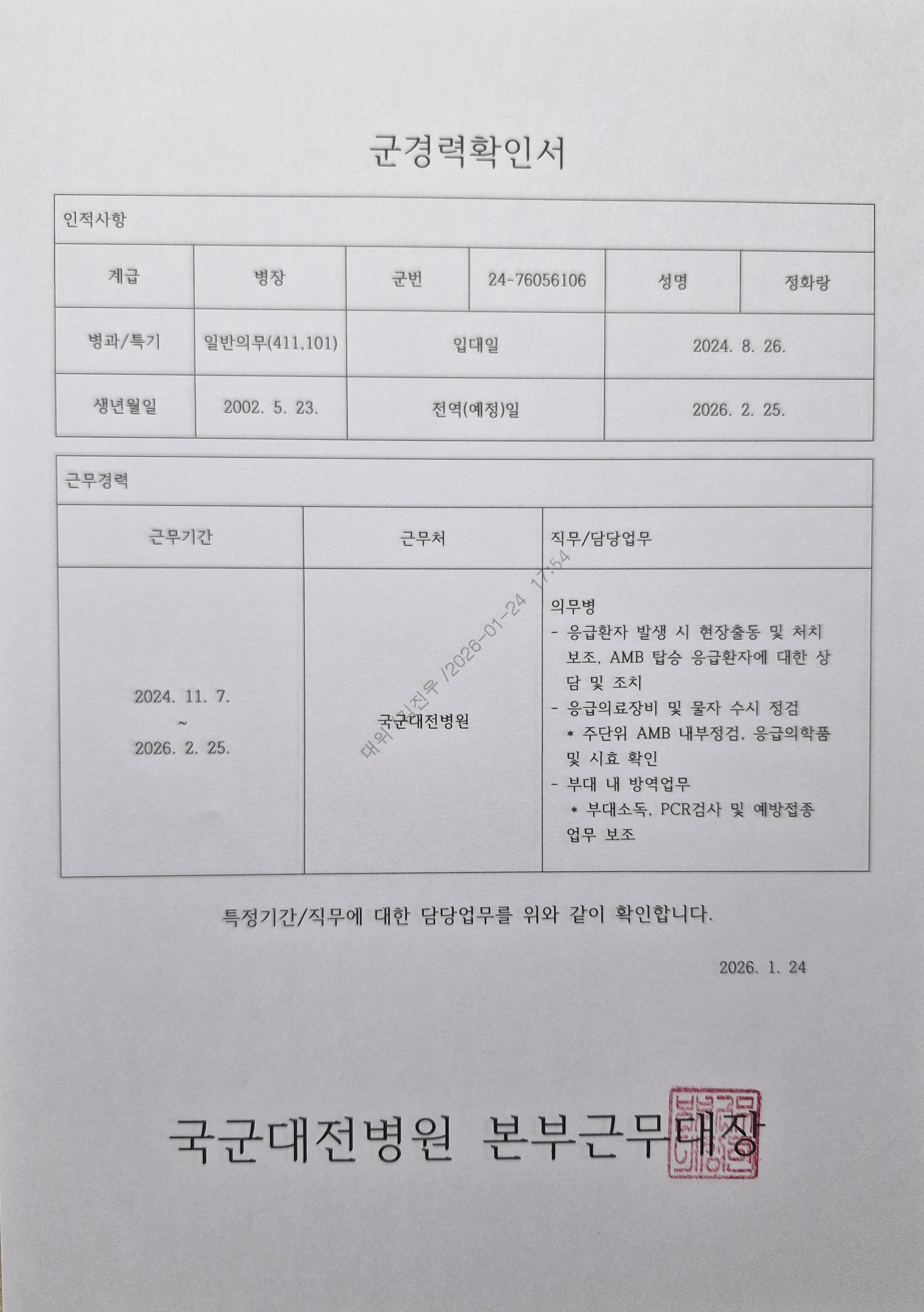 수고많으십니다 다름이 아니라 1급 응급구조사 자격 취득 후 군 병원에서 의무병 복무 후 다음 군경력 증명서와 전역증(복무확인서)를 발급 받았는데 다음 서류들로 경력인정이 가능한지 여부를 문의드립니다.