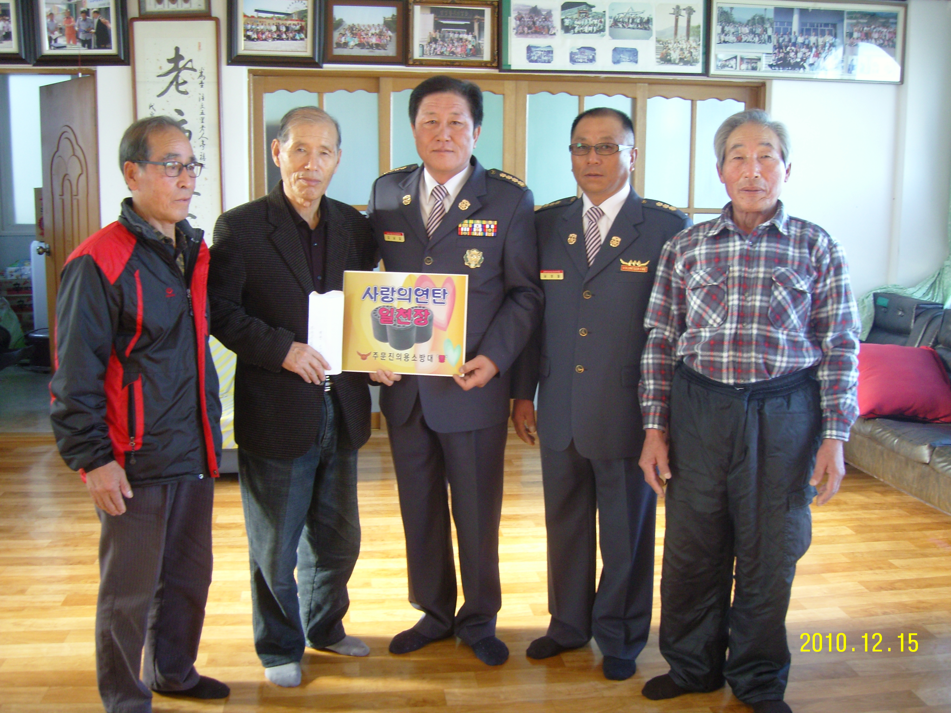 주문진의용소방대는주문5리노인정에매년사랑의연탄을연합대장님외대원님이항상불웃한노인정을찾아사랑의연탄을나누어줍니다