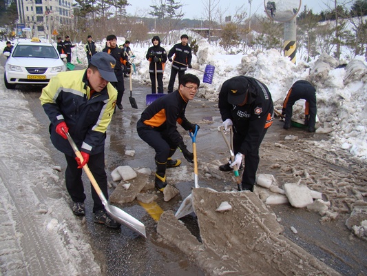 강릉소방서는 2. 17(목) 09:00 ~ 13:00 까지 강릉문성고등학교 입구부터 강릉원주대학교로 이어지는 도로 일대 제설작업에 임했다.