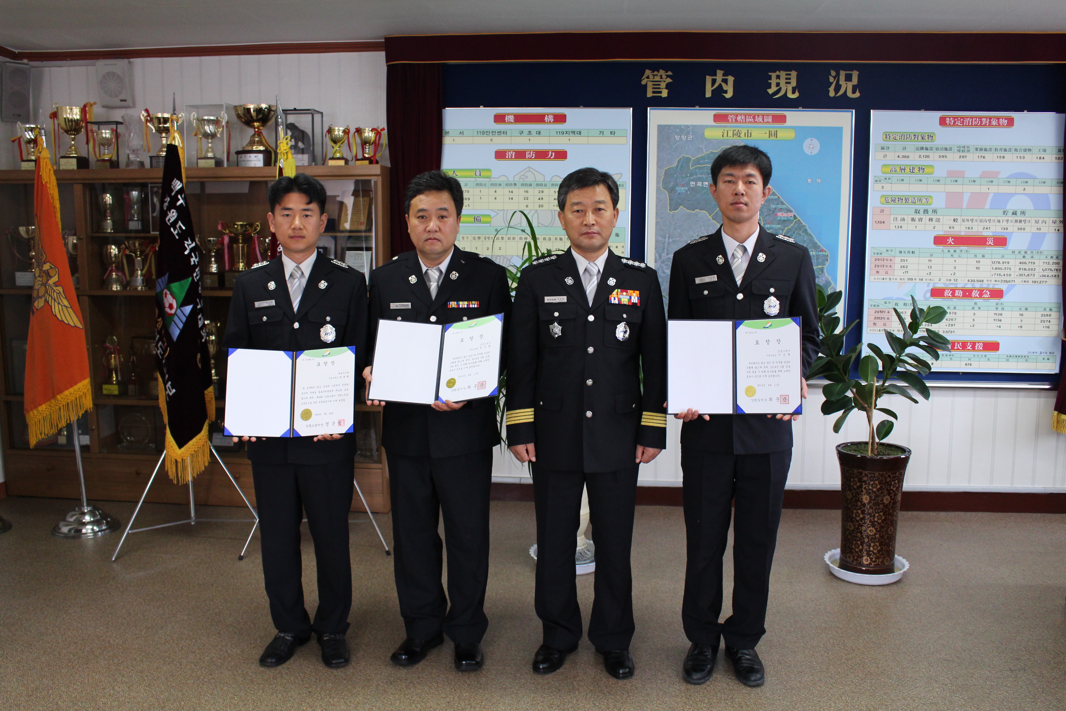 2014. 6. 30. 강릉소방서 서장실에서 자랑스런 소방인(소방교 김남웅) 및 폭설현장 유공(소방위 박근화, 소방교 이승형) 대상자의 표창장 수여식이 있었습니다.