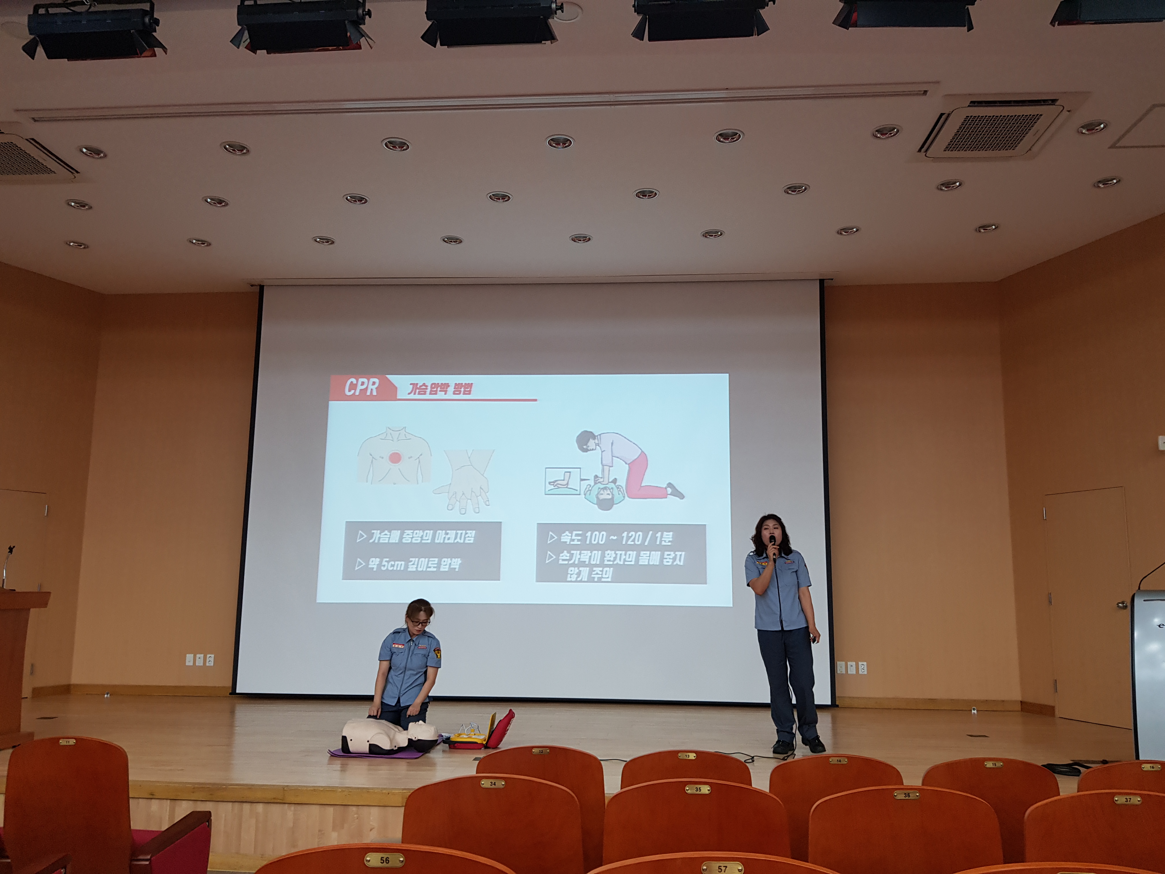 제 4회 의용소방대 생활안전,심폐소생술 강사 강의 경진대회 심폐소생술강사 분야 최우수 수상자인 강릉여성의용소방대 이일화 대원은 예방안전과 교육담당자와 함께 강릉원주대학교 산학협력단 내 입주기업인 100명을 대상으로 심페소생술 교육을 실시하였다.