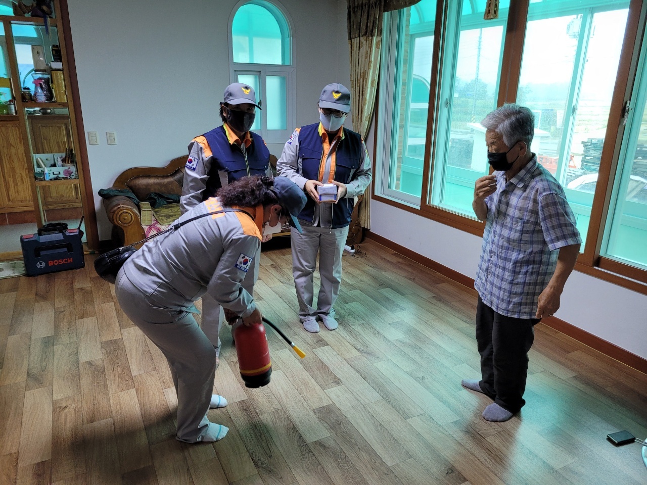 박혜정 토성여성 의용소방대장 외 대원 2명은 소방서 직원들과 지난해 산불로 피해를 입었던 토성면 지역의 가가호호를 방문해 소화기를 지급하고 사용 요령을 교육했다. 화재경보기도 교체했다.