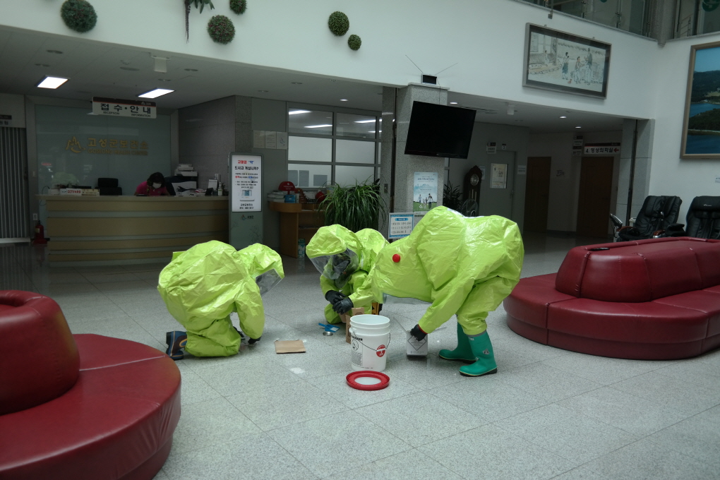 8월19일(수) 오후 2시 고성군보건소에서 경찰서 등 5개 유관기관과 합동으로 생화학 테러 및 재난대응 합동소방훈련을 실시하였다.