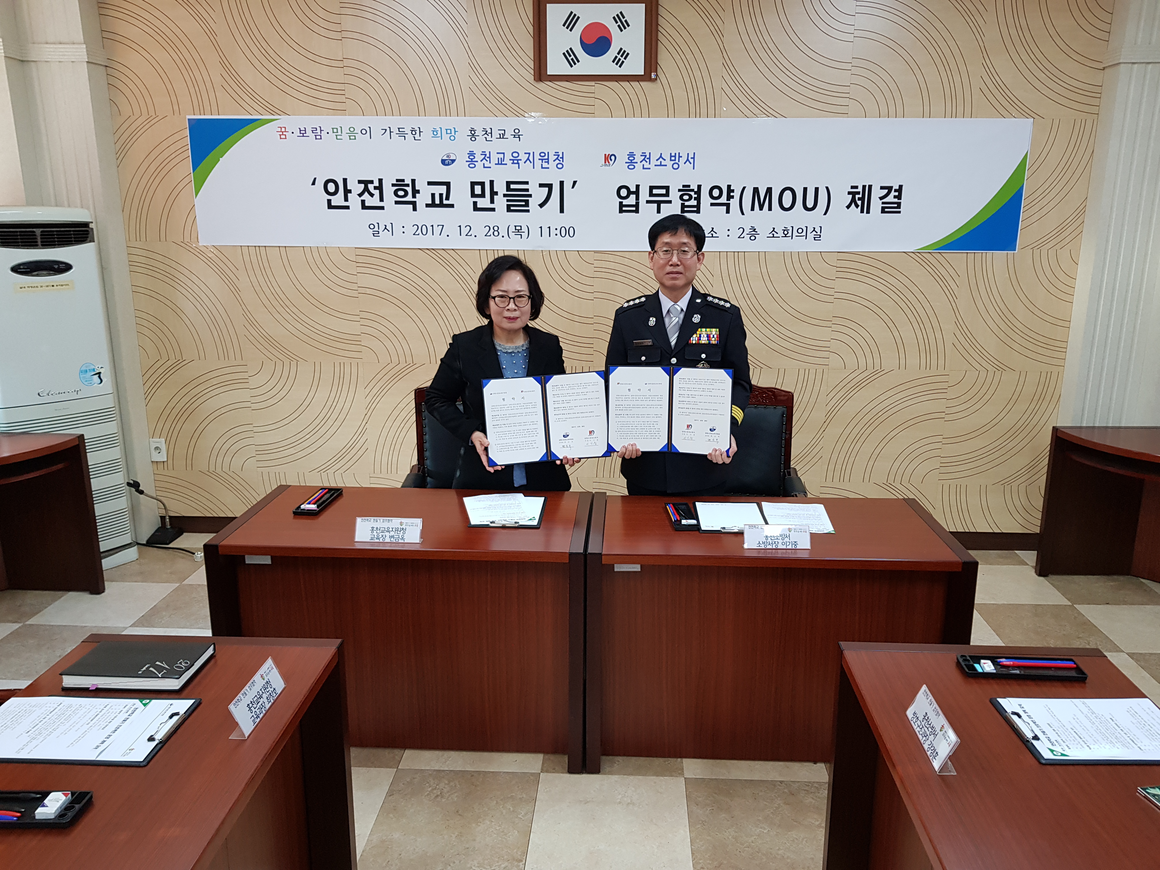 홍천소방서(서장 이기중)는 21일(목) 오전 11시 홍천교육지원청 회의실에서 ‘안전학교 만들기 프로젝트’ MOU를 맺었다.