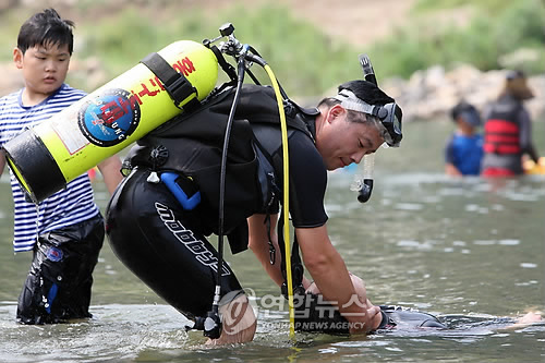 30도를 웃도는 폭염이 지속되는 가운데 물놀이 익사사고 다발지역으로 악명 높은 강원 홍천강에서 15년째 물놀이 피서객의 안전을 책임지는 홍천소방서 119구조대 소속 용상순(42) 소방장
