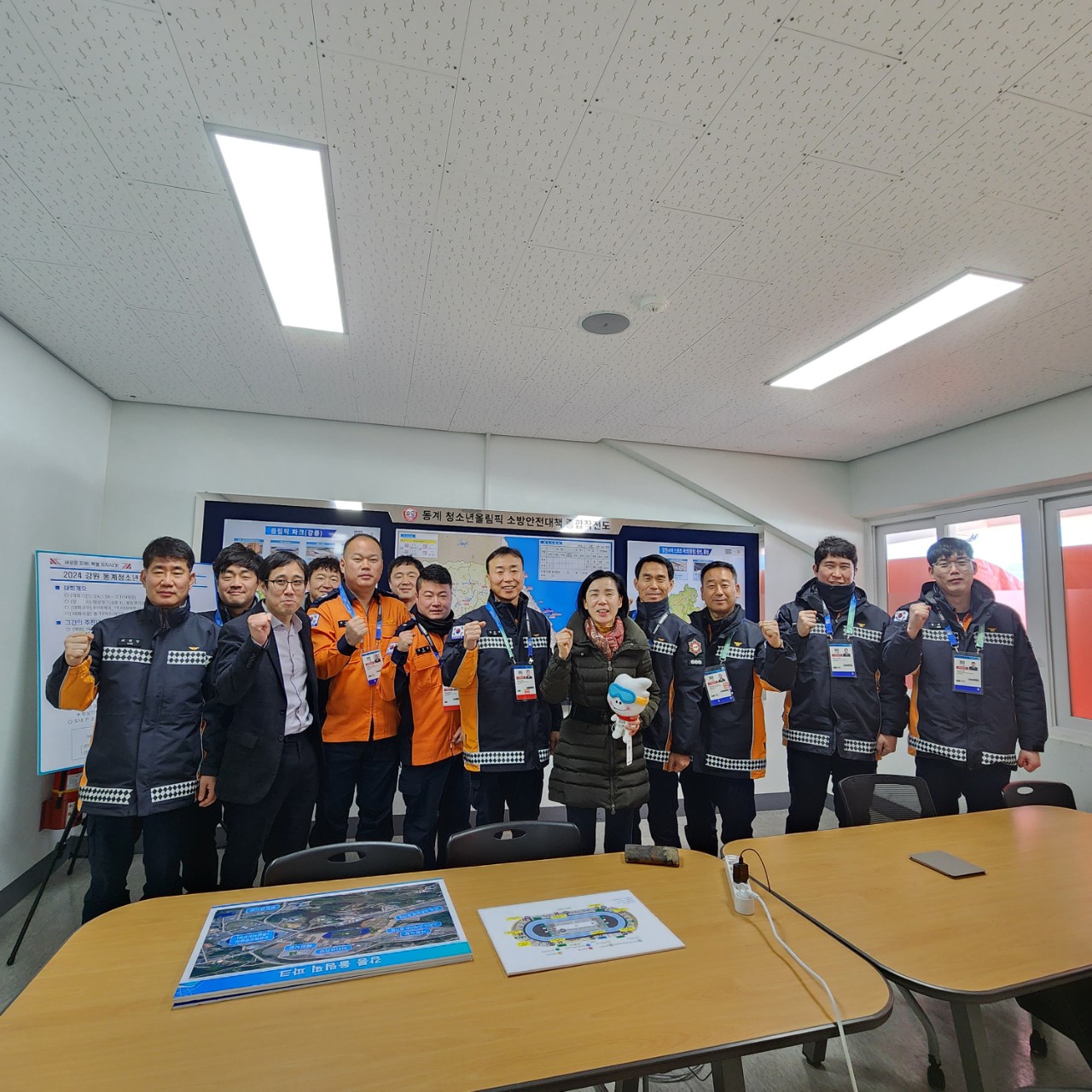 홍천소방서장과 직원 및 의용소방대원 120명은 11:30분에 강릉시 오벌 스피드스케이트장에서 열리는 경기를 관람하며 열띤 응원전을 펼쳤다.