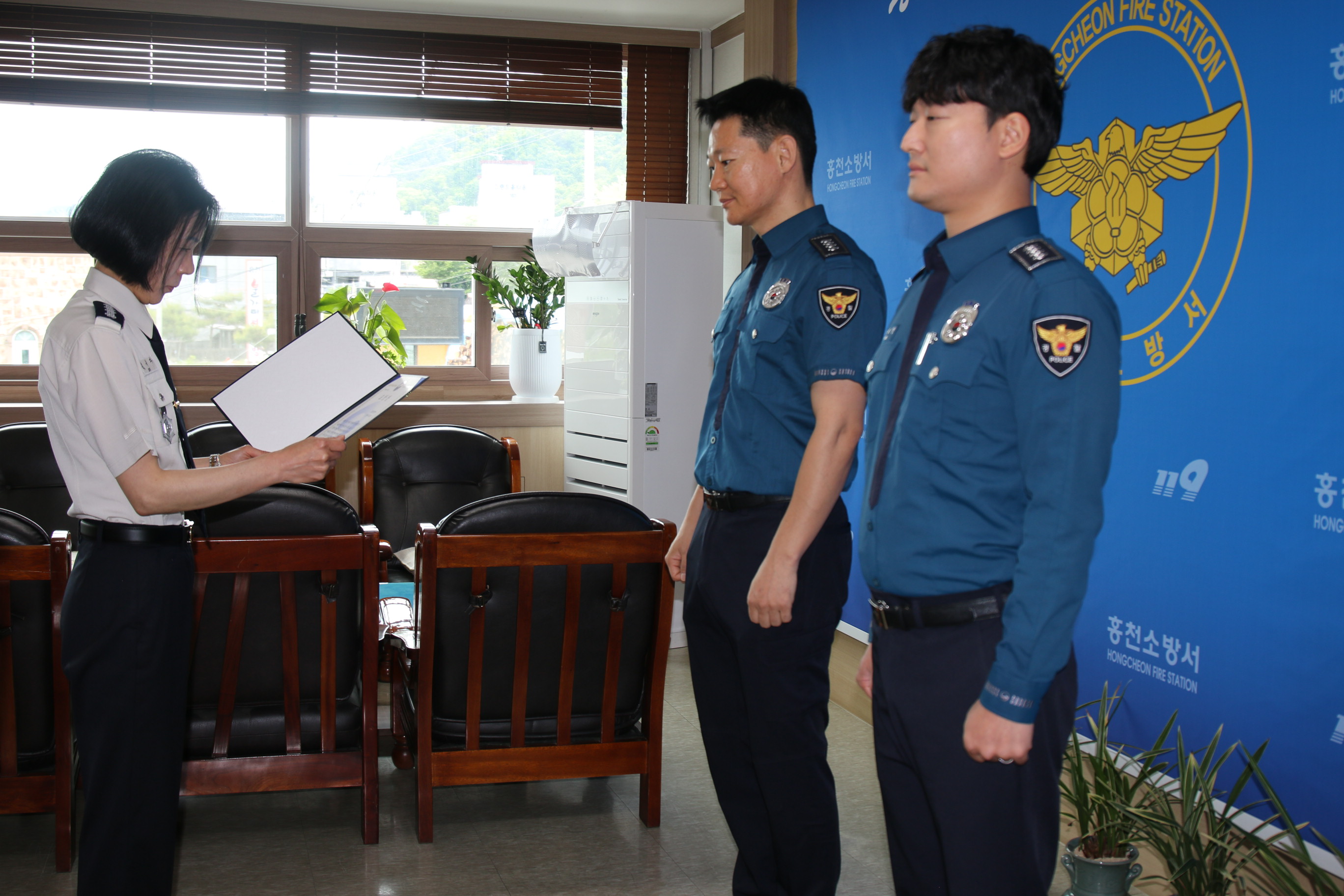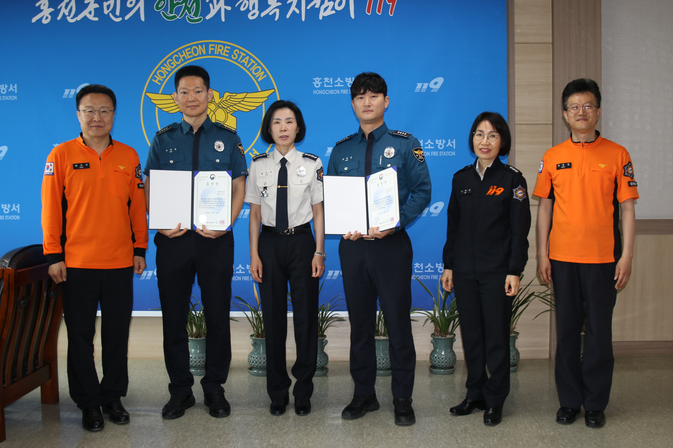 홍천소방서(서장 김숙자)는 17일, 화재진압에 기여한 공로를 인정받은 홍천경찰서 이후돈 경사와 최태진 경사에게 서장 표창을 수여했다고 밝혔다.